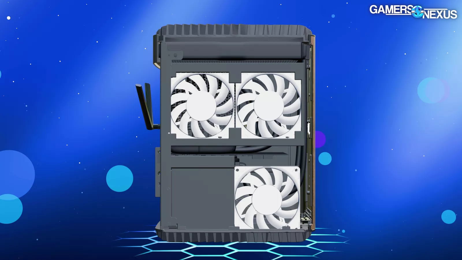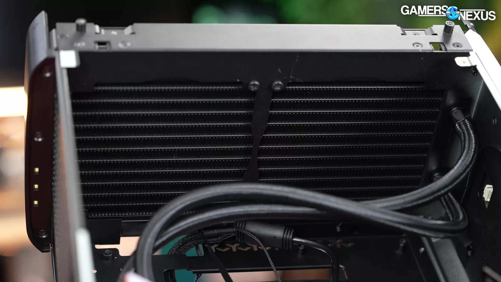 3 fans are revealed from removing the left panel. Some of these are on a hinging mechanism that we actually liked, if not for all the other problems. It’s a good way to get side intake without the panel itself being tethered to a cable. Opening the hinged door reveals the top exhaust fans mounted to the GPU radiator, with one fan attached to CPU liquid temperature.