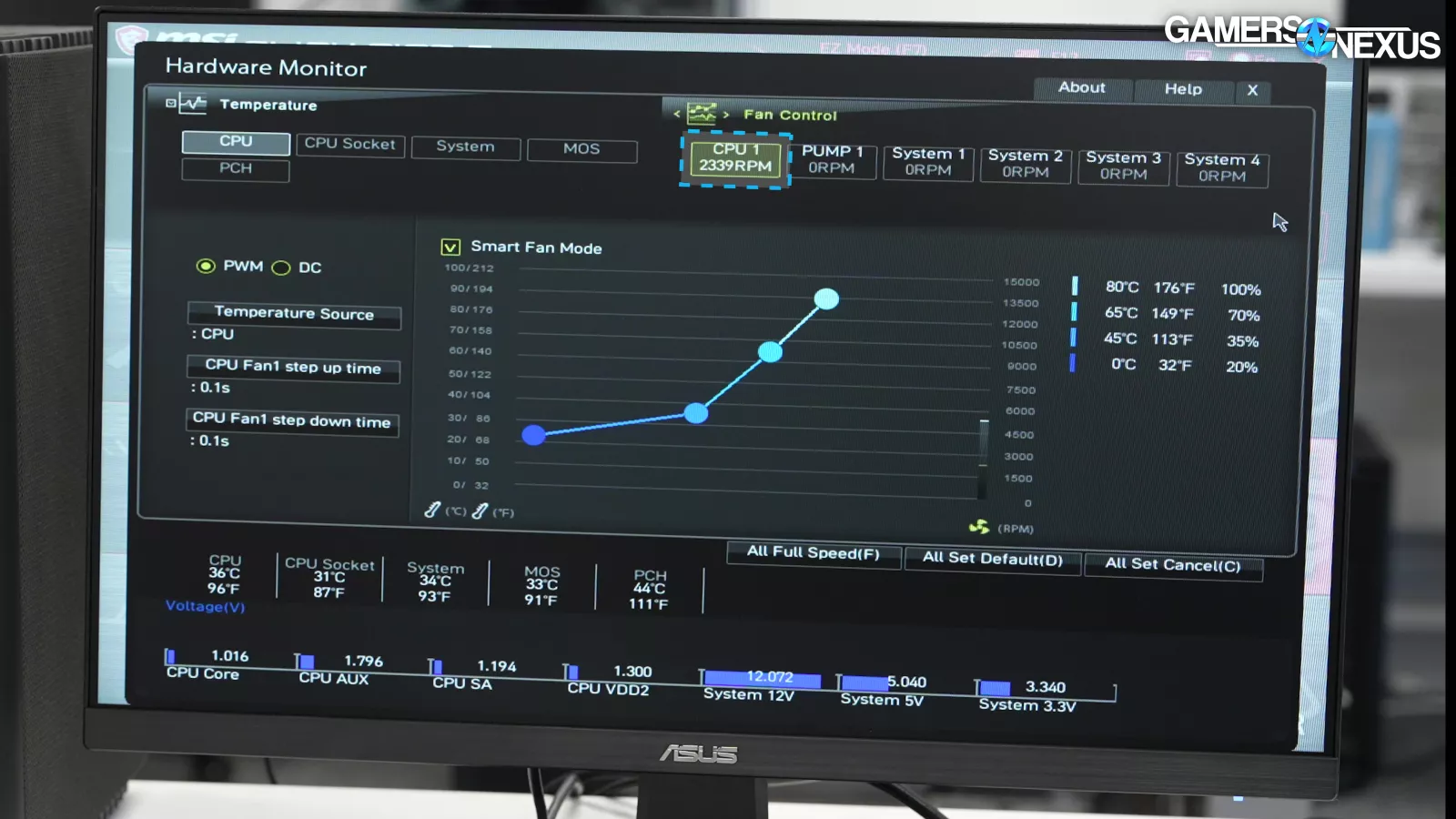 BIOS also lacks any way to control the fans. Only CPU1 is shown, but this is actually one of the CLC pumps. None of the 5 actual fans are attached to the motherboard itself, and therefore can’t be controlled here.