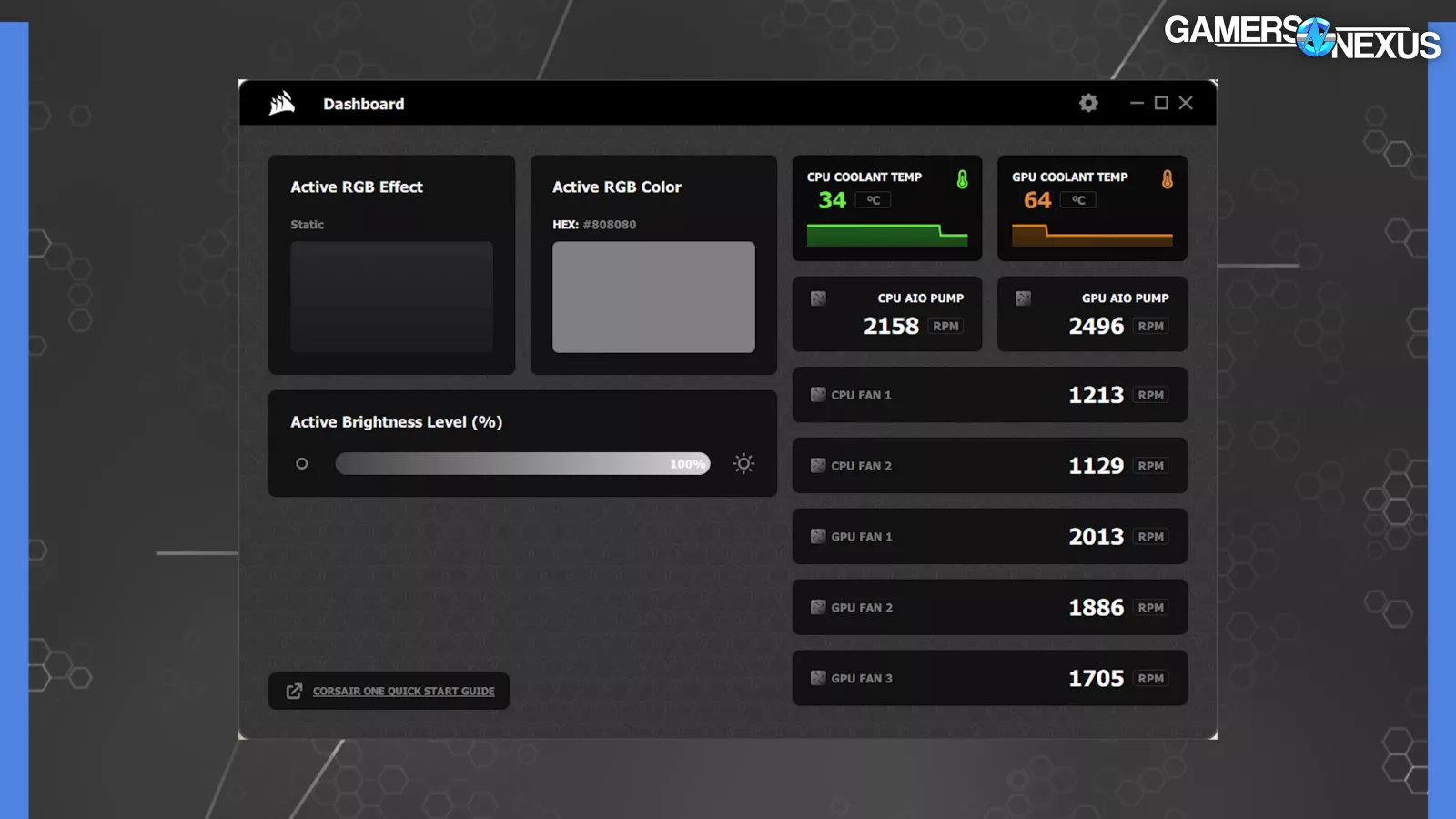 The only actively running non-Windows software was the Corsair One Dashboard. It’s a barebones utility for changing the case lighting and monitoring liquid temperatures and fans speeds; however, it can’t change the fan speeds. It doesn’t even remember your RGB settings all the time. We think it’s strange Corsair didn’t go with the more mature iCUE software here.