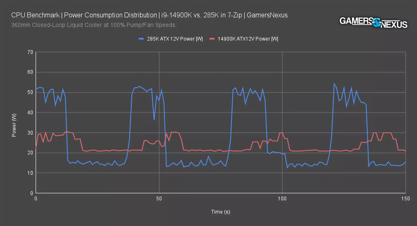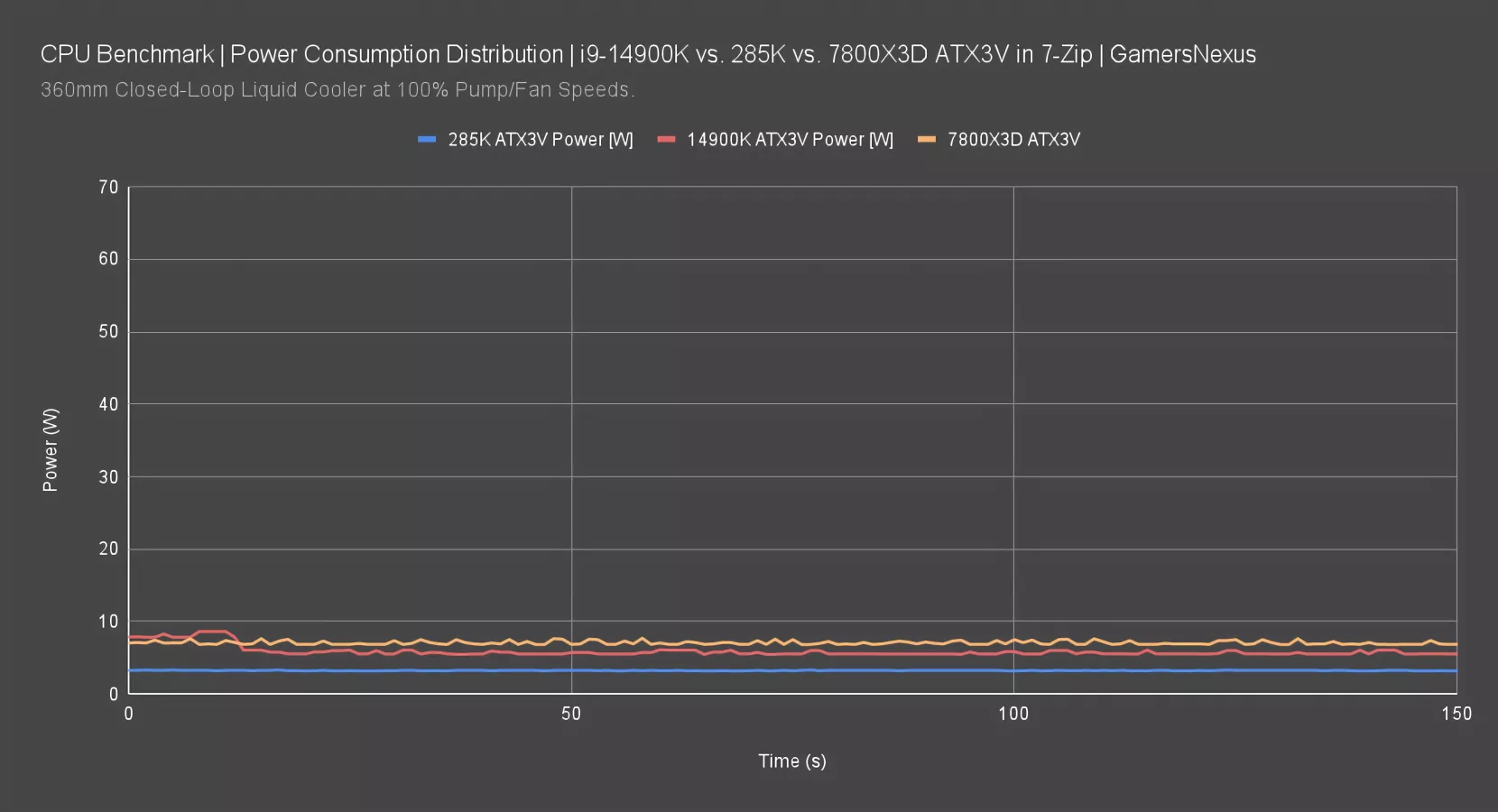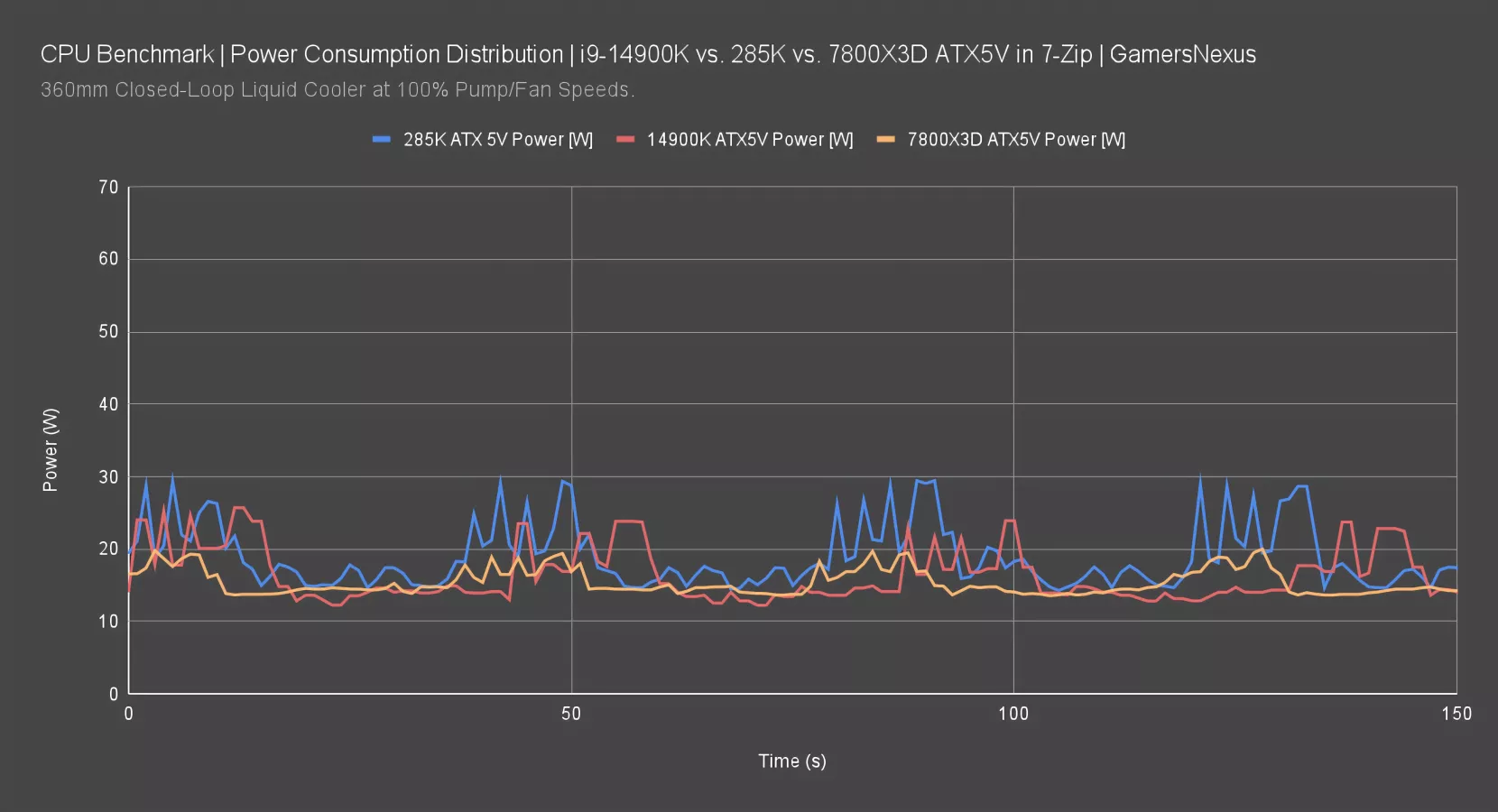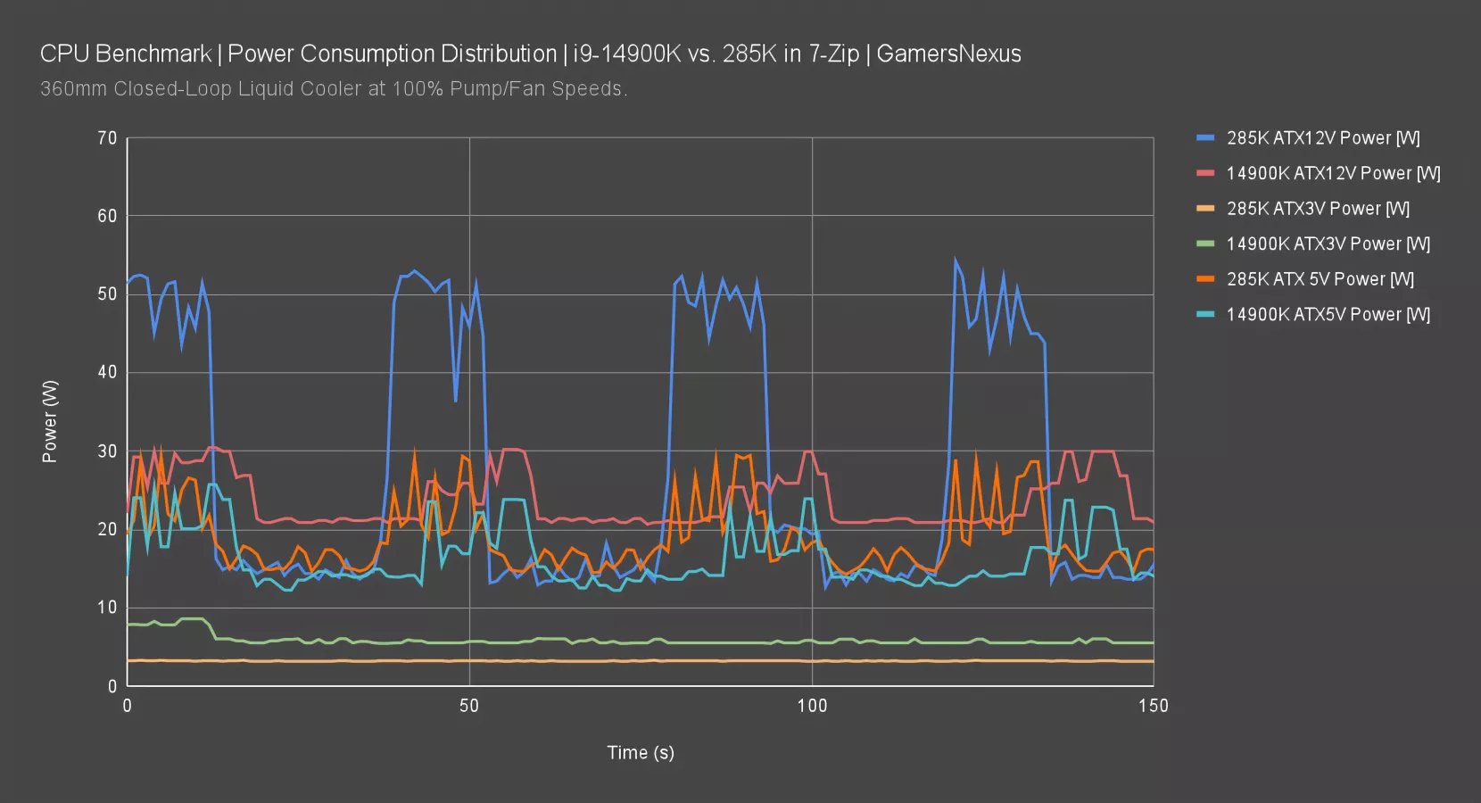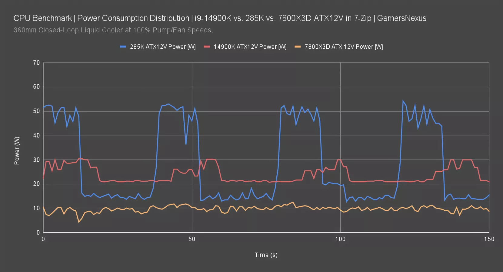 The 285K and 14900K ATX12V remains from last time. The 7800X3D was pulling about 12W ATX12V fixed during this test and didn’t seem to fluctuate based on load at all. It appears fairly isolated. Typically, this gap of 10W comes out in the wash when you’re talking a 280W 14900K versus an 80W 7800X3D, so it’s just part of the usual margins. In this scenario, however, the difference against the 285K really starts to show.