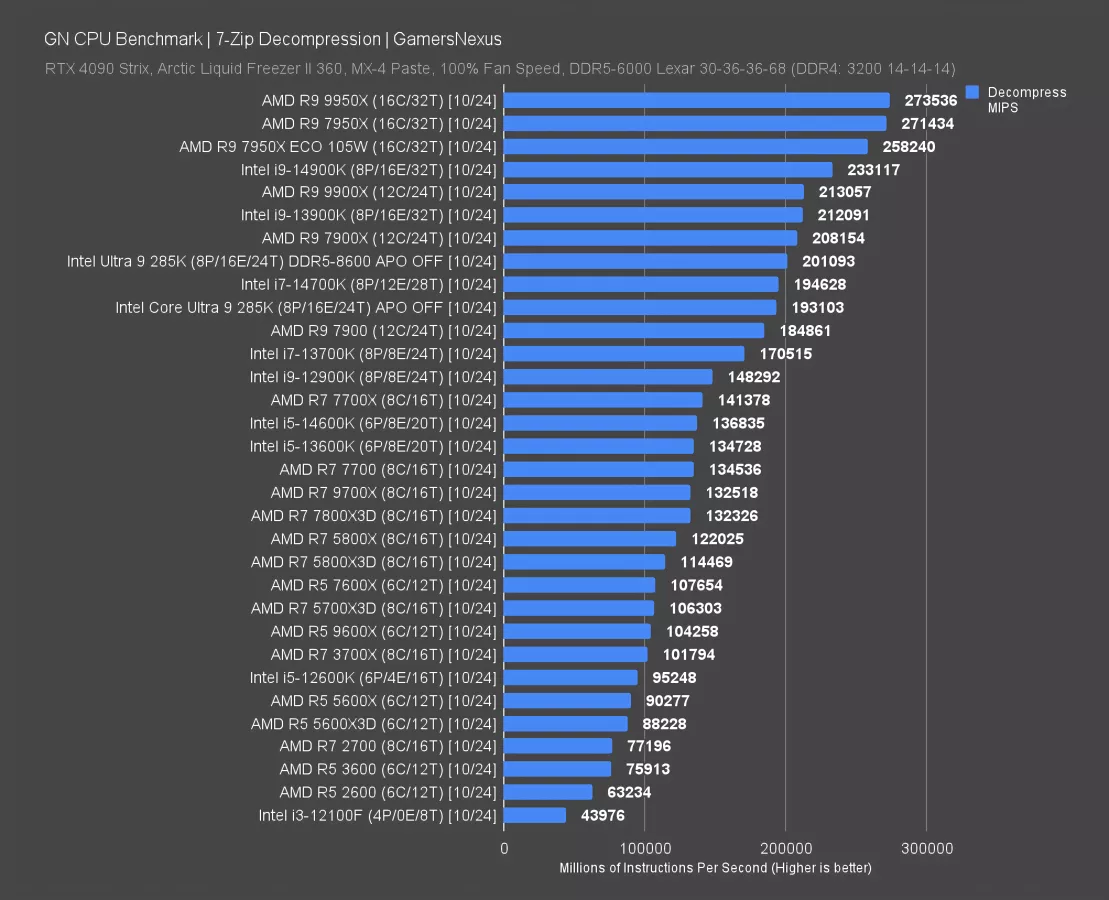 Decompression doesn’t benefit as much, posting a 4% improvement. The stack also shuffles, with the 9900X and 7900X both surpassing the 285K here. The memory subsystem benefits don’t translate as much as they did in compression, both stock and with the better RAM.