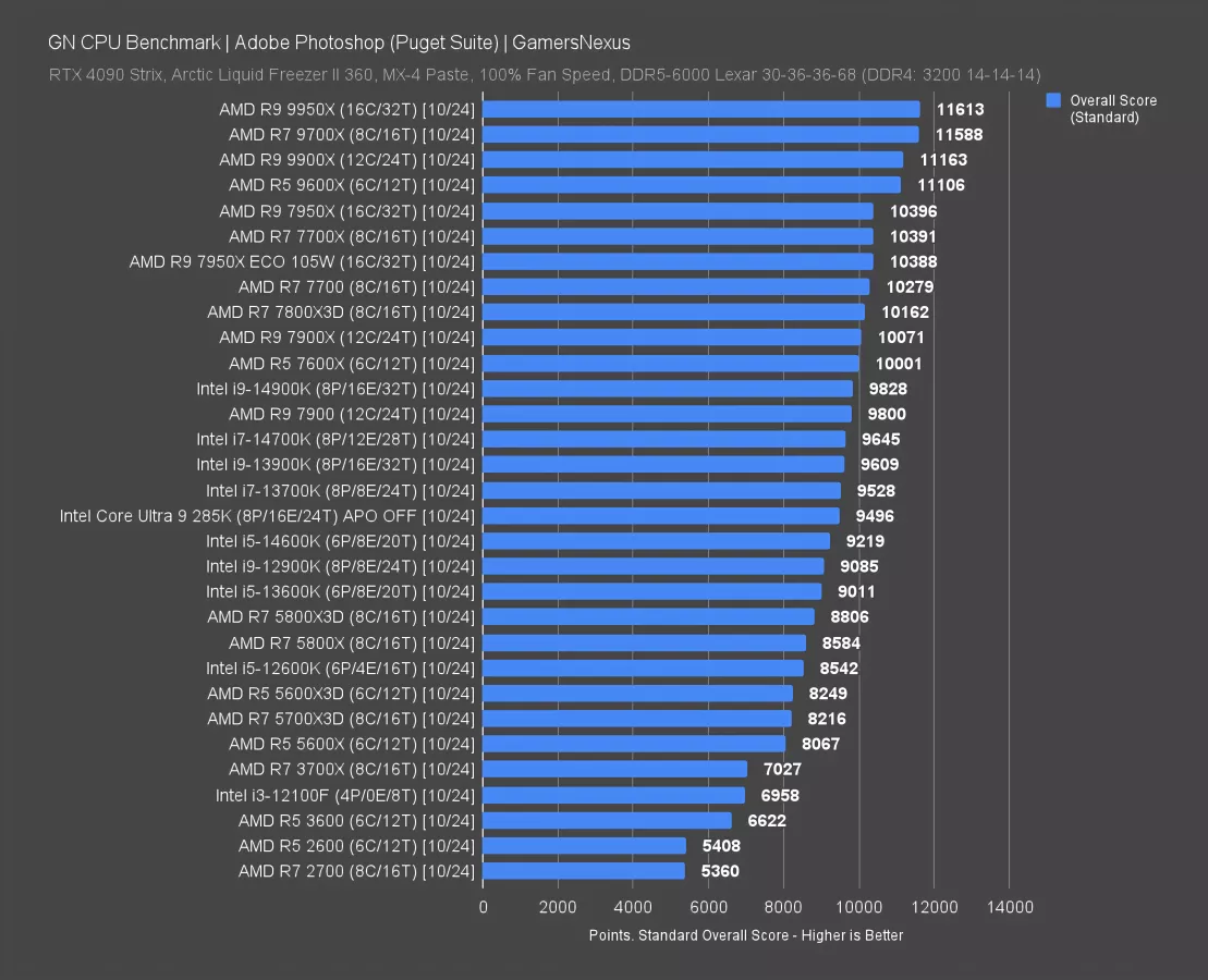 In Adobe Photoshop, AMD has a clean sweep of the entire top half of the charts. Those of you who’ve been watching us for at least 5 years will remember an era where it was the opposite. The first Intel entry doesn’t appear until below the 7600X, and that’s the 14900K.