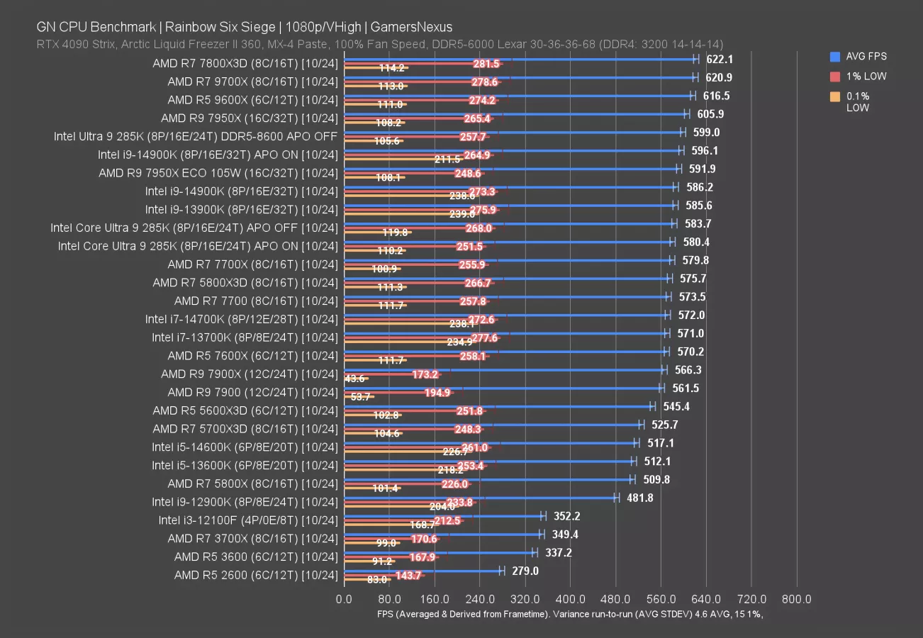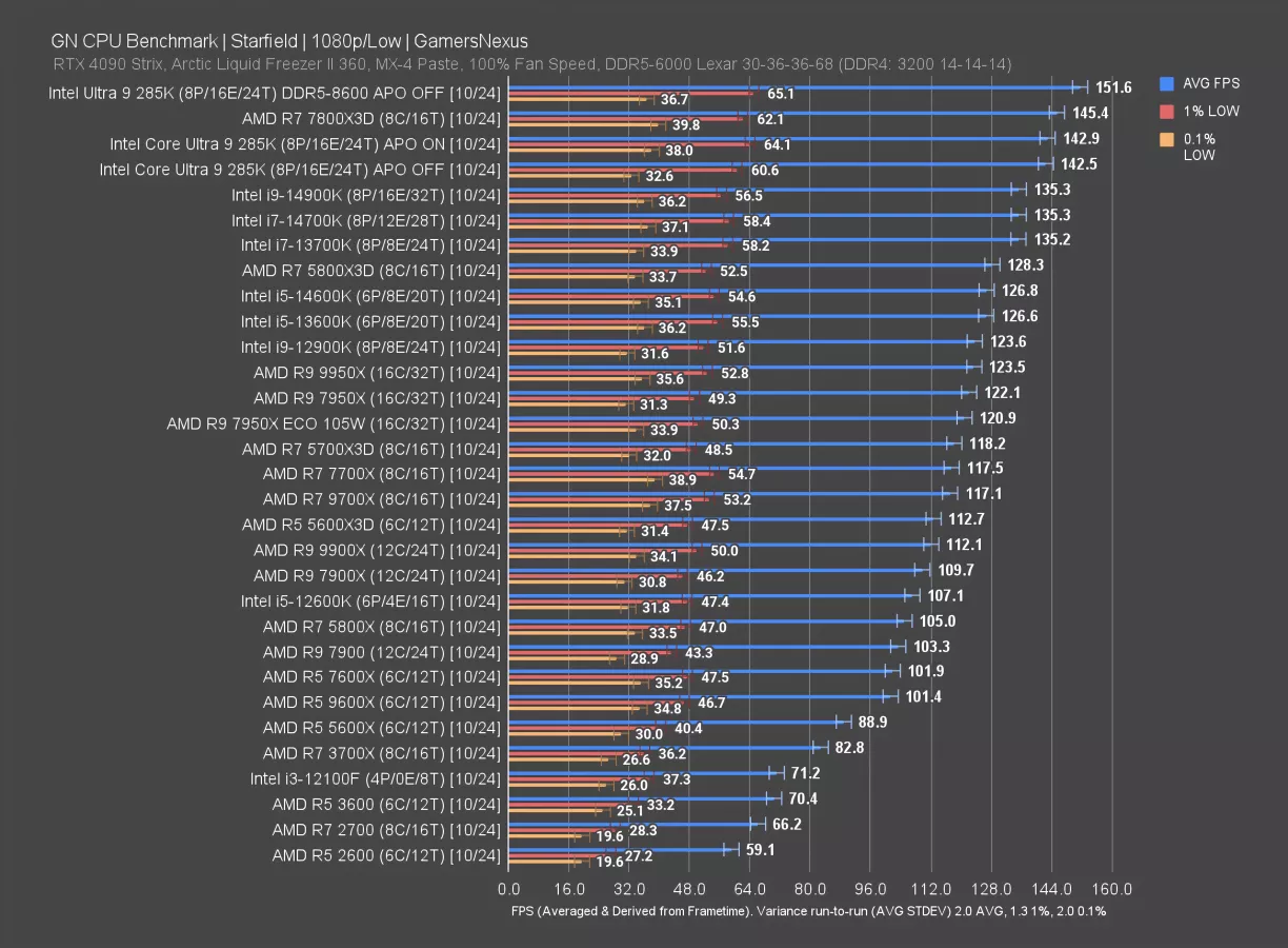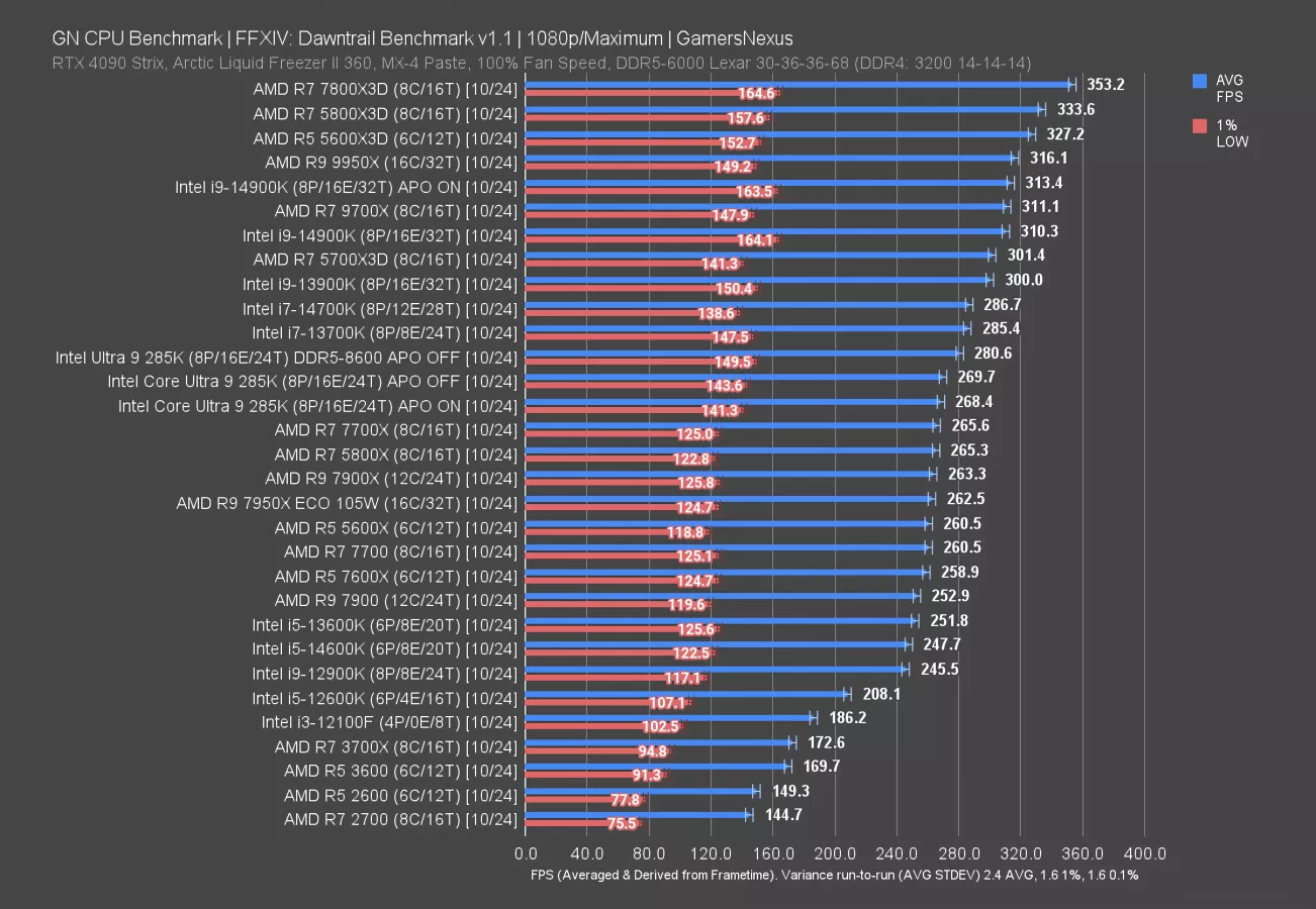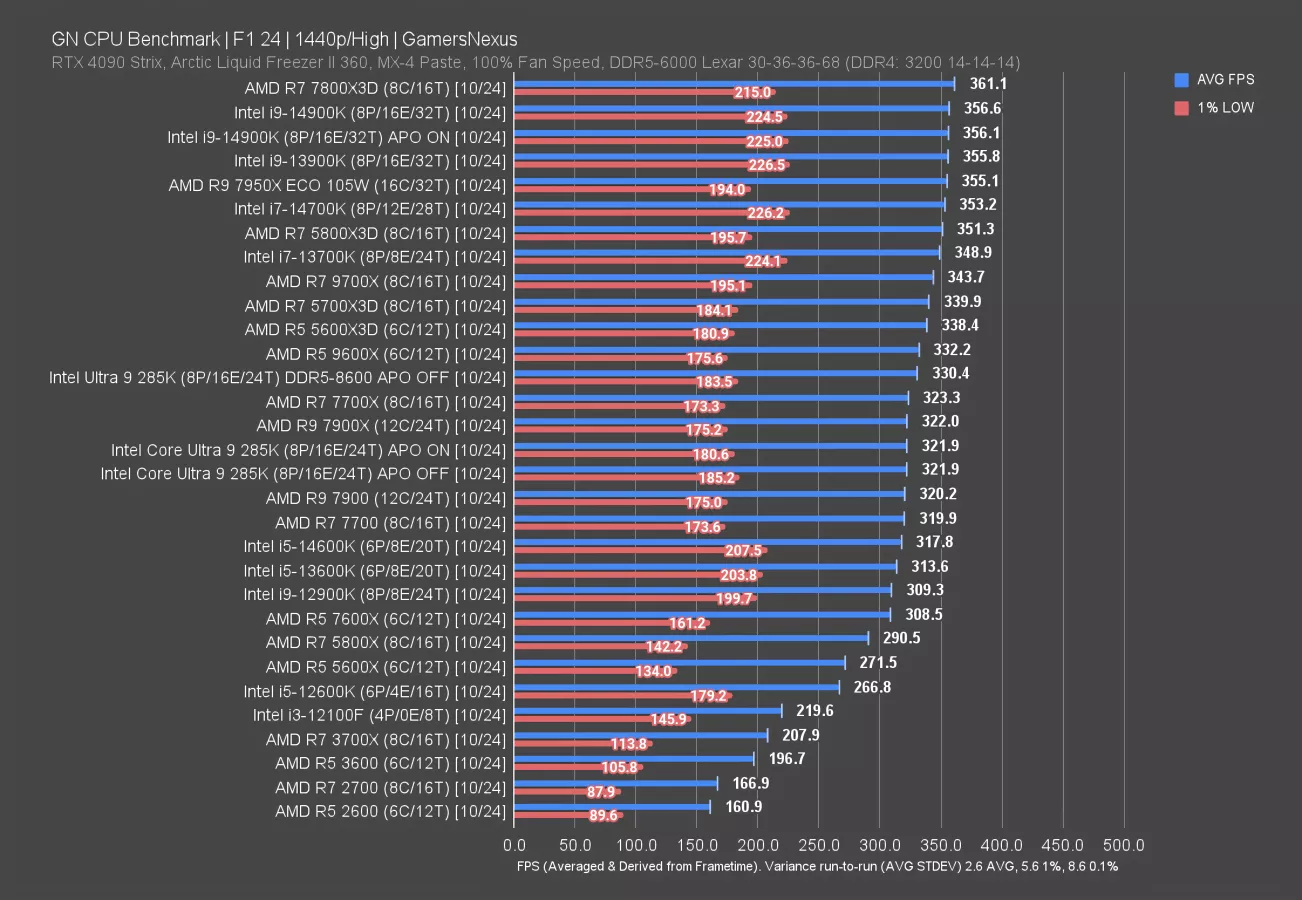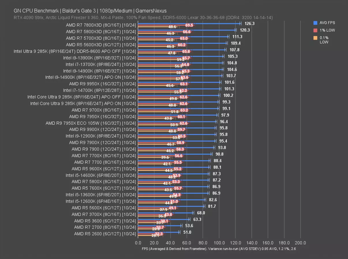 The 7800X3D establishes a 26% lead over the 285K, at 126 FPS to 100 FPS AVG. The 14900K leads the 285K by 4.5%, at about 105 FPS AVG.