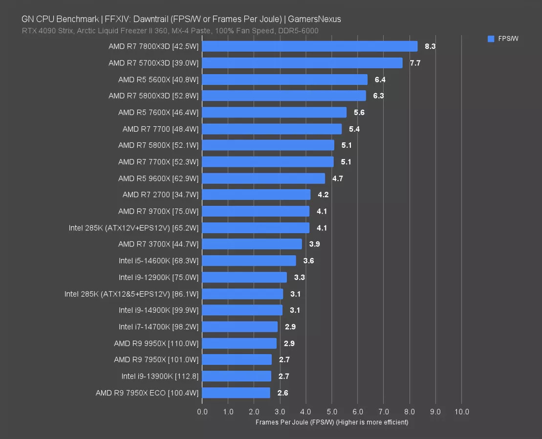 The 5800X3D and 5600X3D are also at the top here, showing that Dawntrail just generally really likes cache, at least on these CPUs. The 5700X3D is a little lower down since its frequency is 300MHz below that of the 5600X3D, so these results make sense.