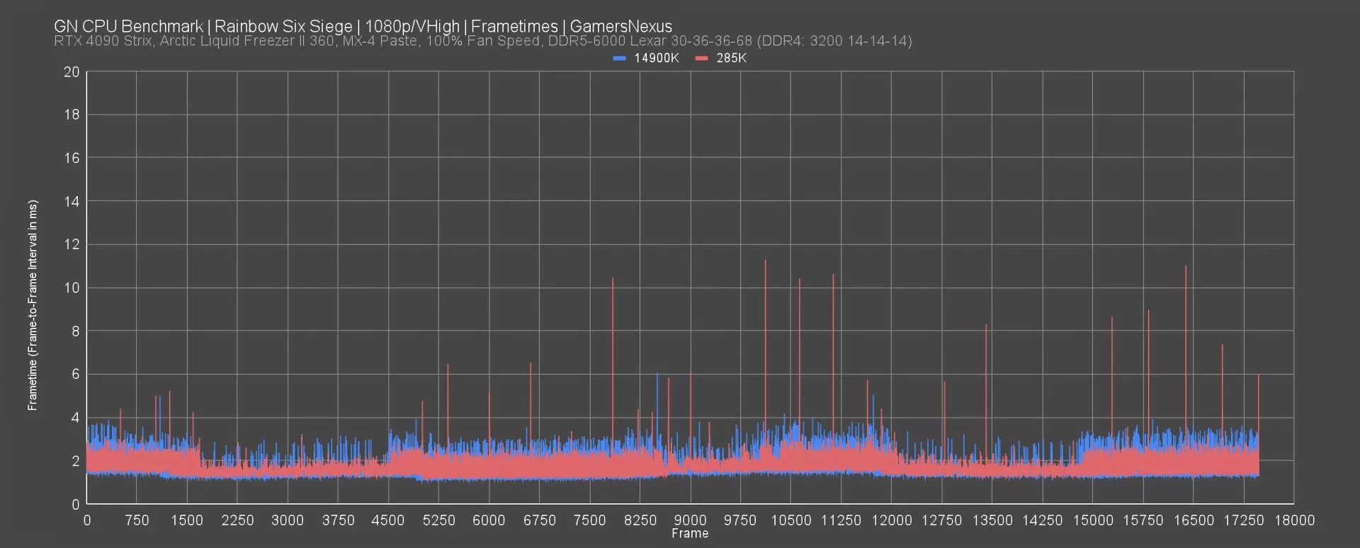 This frametime plot shows the 14900K is overall highly consistent frame-to-frame, with most of the intervals deviating at most by 2ms. There are a few spikes, but only one notable spike to 6ms -- which is a 4ms deviation, and thus wouldn’t be noticed by the vast majority of users.