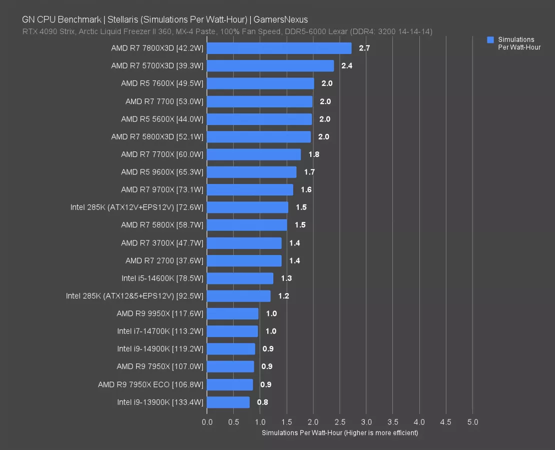 If your power costs $0.10/kWh like ours, then you’d need to play the highest CPU load games for 8 hours a day for an entire year in order to gain $19 of value in power bill reductions for the 285K against the 14700K. At $0.15, the shut-in gaming levels would give the 285K a savings of $30 over one year of literally playing Starfield or Cyberpunk as a full-time job. At the peak of degeneracy that we all strive to achieve, you’d have to play games at this pace for 10 years to have spent more on power than the cost savings of buying the cheaper CPU (it’s the delta, not total cost). Maybe throw in a cheaper cooler as well since power is down and call it 8 years.