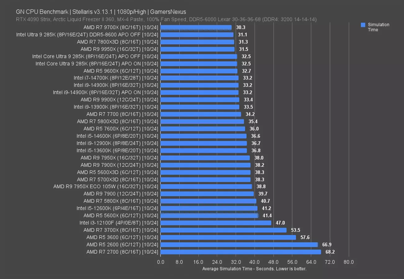 Boosting memory helps in this game, so the 285K benefited from a 4.3% reduction in time to complete the simulation.