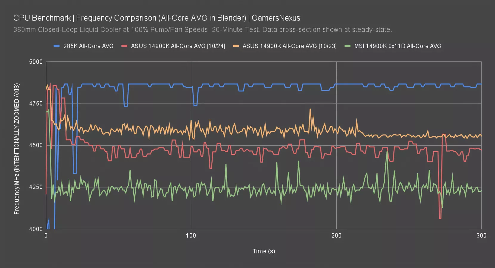 Finally, this chart shows the all-core averages in the same test. The 285K averaged 4867MHz when factoring-in the E-cores, with the modern 14900K just below 4500MHz and flanked by the two older entries.