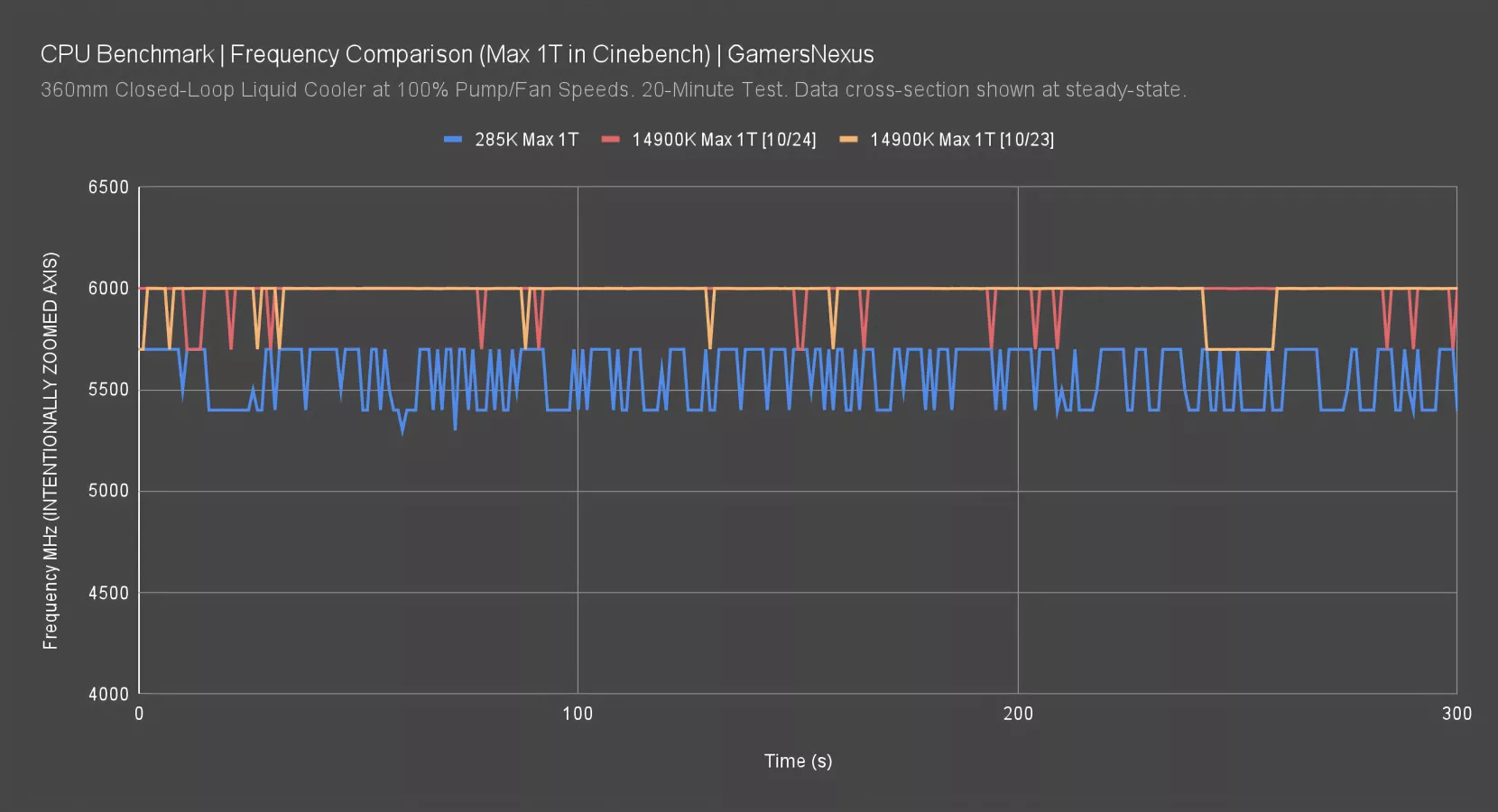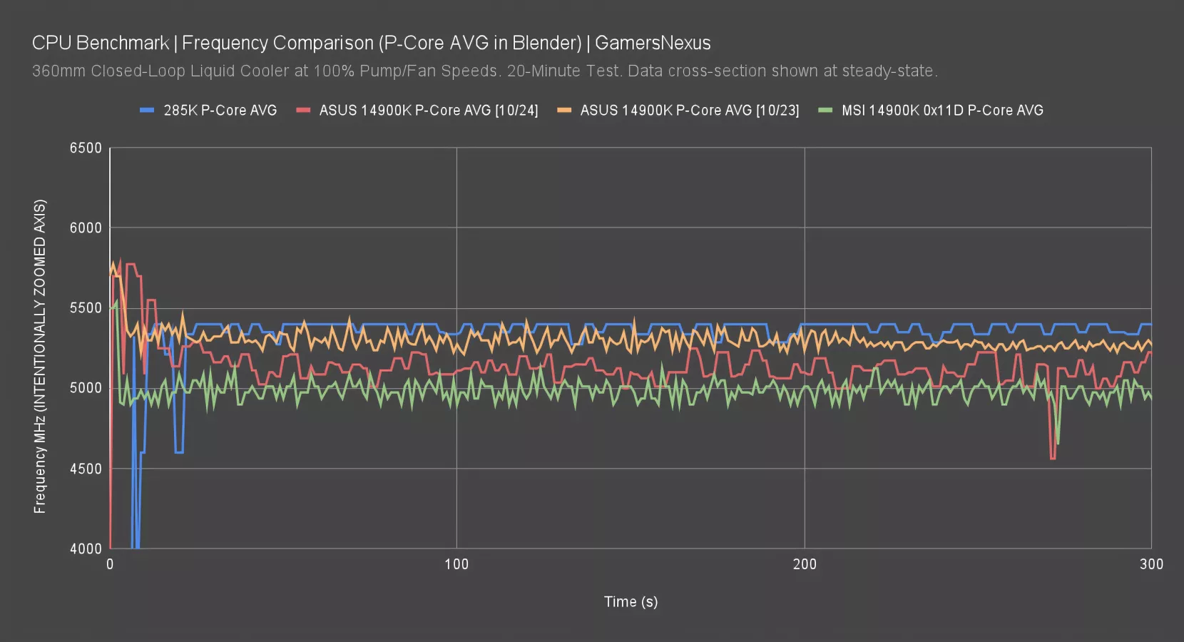 The 285K maintains an average P-core frequency of 5400MHz in this testing. It’s relatively flat. That has it higher than the 2024 ASUS test entry, which is what we used for our review comparison today, at around 5100-5220MHz. The 2023 launch entry was higher, at 5280-5400MHz on average. The microcode changes may have affected this since launch. The MSI 0x11D microcode entry had the CPU at around 5000MHz from the same window as the ASUS 2023 entry. The most up-to-date frequency entry sits between the two flanks of early 14900K tests.