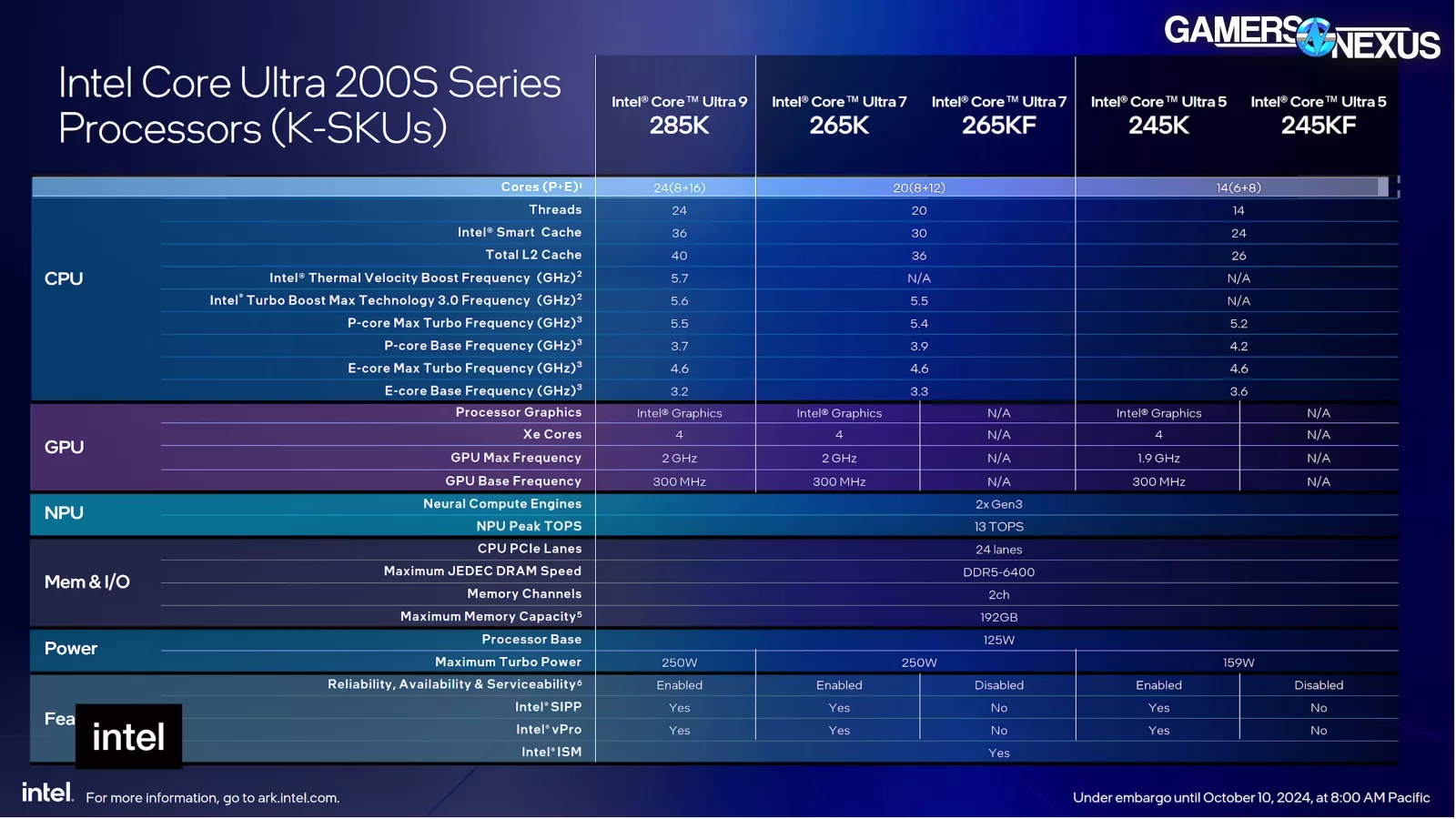 Intel has gotten rid of hyper-threading and is instead moving to just P-cores and E-cores with these CPUs, so the 285K has 8-P cores, 16 E-cores, and 24 threads against the 14900K’s 32 total threads. Frequency is also down, now at 5.7GHz advertised but because the architectures are different, you can’t directly compare the frequency numbers. We’ll review the 245K next, but that one’s at 6 P-cores and 8 E-cores.