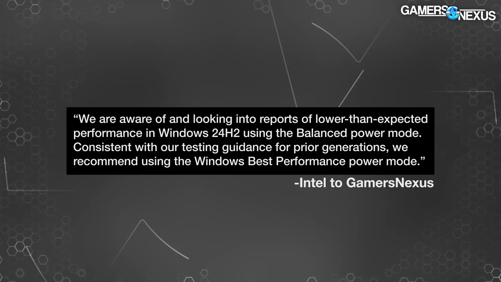 Additionally, Intel sent a statement about power profiles where balanced power on 24H2 results in uncharacteristically bad performance. We test with high performance except where we’re specifically required to use balance in some X3D situations so this didn’t affect us but does represent one of Intel’s launch problems.