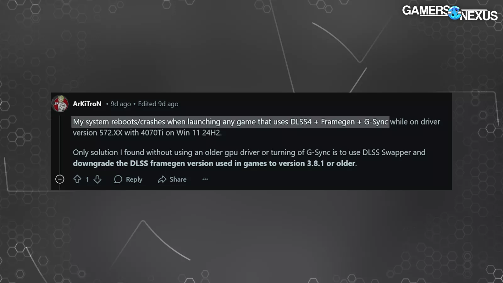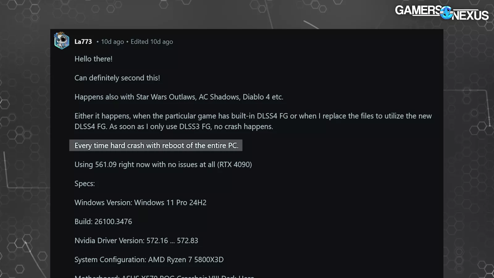 Many users saw problems in games that didn’t occur until after multiple hours of gameplay. As much as we’d like to, we can’t spend several hours playing a random game to see if it will possibly crash. It’s just too unpredictable. On the same note, just because we weren’t able to repeat our failure when we turned G-Sync or frame gen off, doesn’t mean that turning these options off will solve all problems, but hopefully it’ll help some of you.