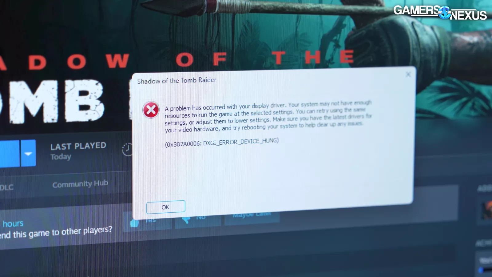 The error in Shadow of the Tomb Raider was different from the games previously discussed. This game was unaffected by G-Sync. It also doesn’t feature a frame gen setting (at least the version we tested doesn’t). Additionally, it experienced the same failures on a single monitor and after swapping output slots. So none of the other issues we’ve talked about thus far were the cause for Shadow of the Tomb Raider.
