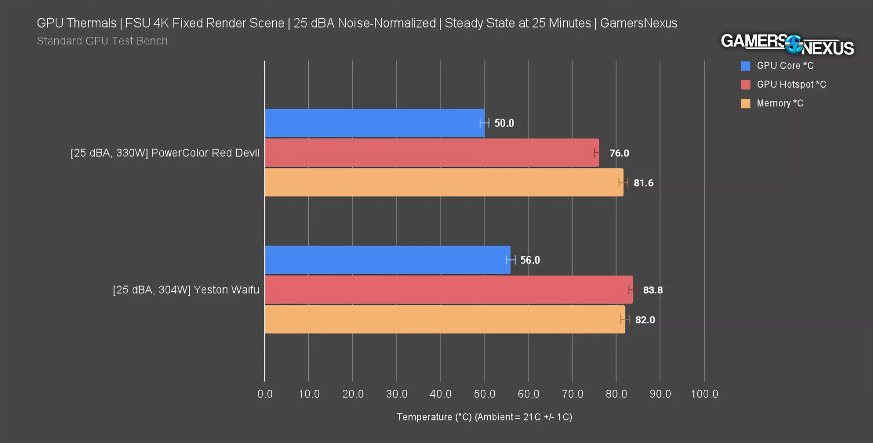 In FurMark at 25 dBA, which loads the GPUs more heavily on the VRM, the GPU temperatures ended up comparable between these with the memory temperatures favoring the Waifu by about 2 degrees reduced from the Red Devil.