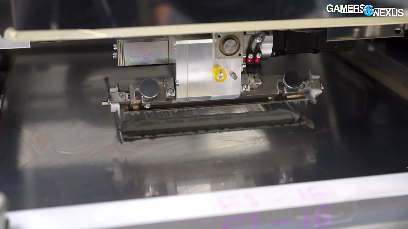 We also have a few shots where they paused the line for us to see the interior of the machines, but they had to be turned off for these shots. You can see each of the reels feeds into this like ammo belts, with the moving head actuated by gas lines and compressed air.