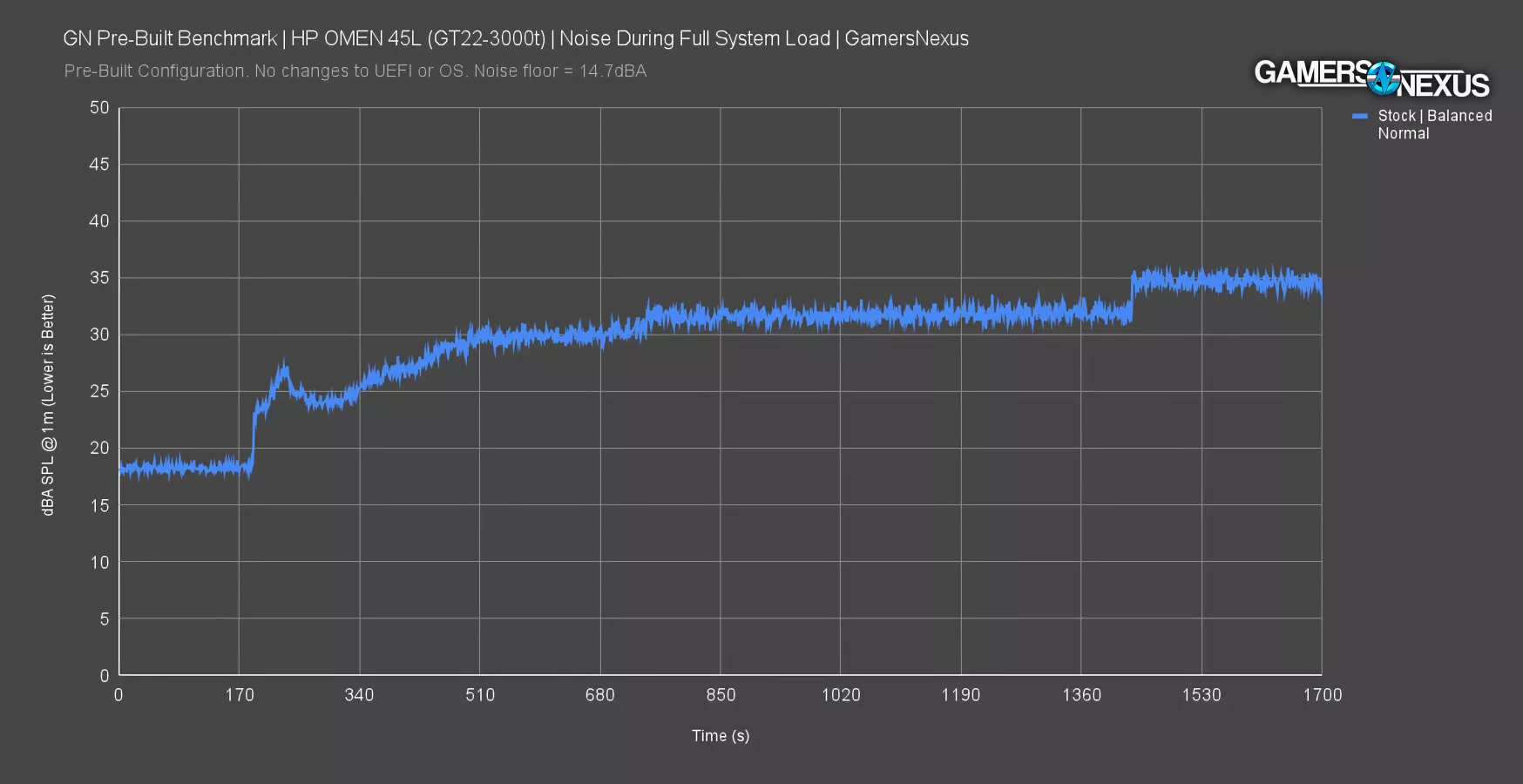 After that, it’s a slow and steady rise to 30 dBA, followed by a slight step up, then finally another step up to settle at 34.7 dBA average. The ramps are stairstepped in a way that makes sense, if only the rest of the computer did.