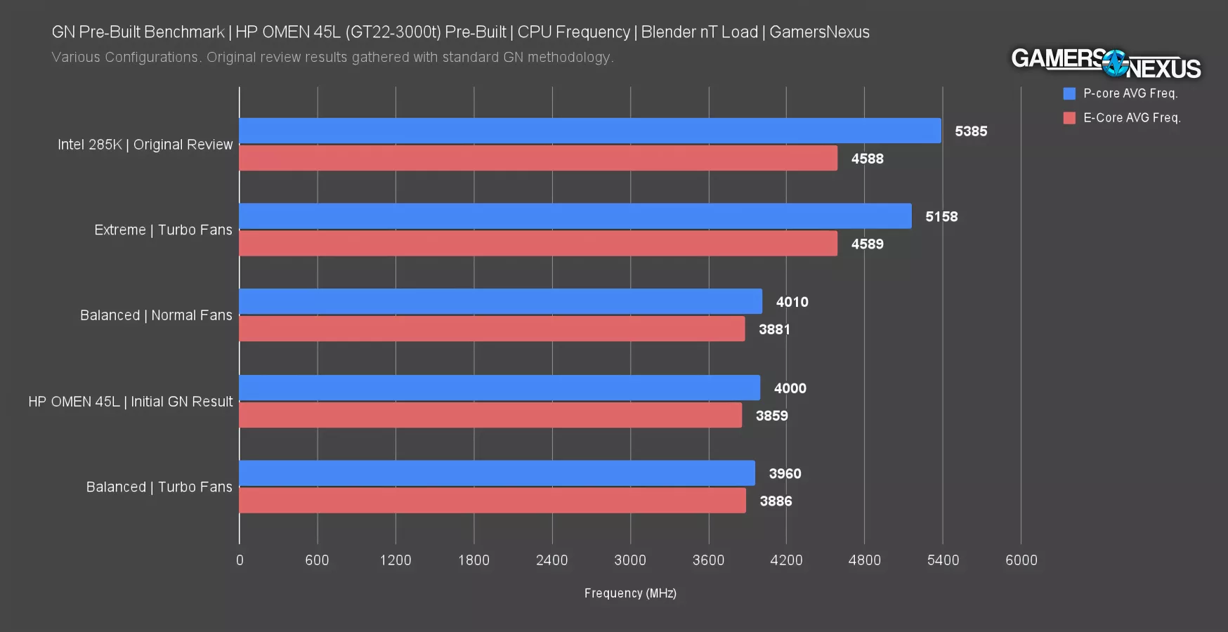 Using HP’s various preset profiles and some of our own custom tests, we found that the CPU frequency gets closer to stock DIY expectations -- but still not quite there -- by enabling “Extreme” mode for the power budget and “Turbo” fans. That sets the higher power limit and we’ve now admitted to voiding our warranty, apparently, but that got us to 5158MHz up from the 4000MHz range. The various other tests included a 4010 MHz entry with Balanced and normal fans and a similarly poor result with Turbo fans and balanced. The result isn’t that different with the constrained power limit.