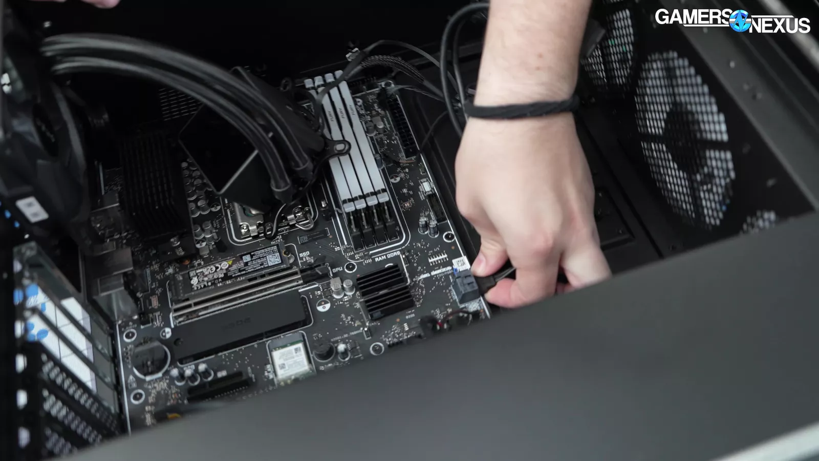 Removing the back side panel, we noticed a plate that said “required for VRM cooling,” which we proceeded to take off. This exposed some thermal pads for the VRM mosfets, which is a nice touch, but it’s hard to appreciate when the CPU runs up to 105 degrees Celsius.