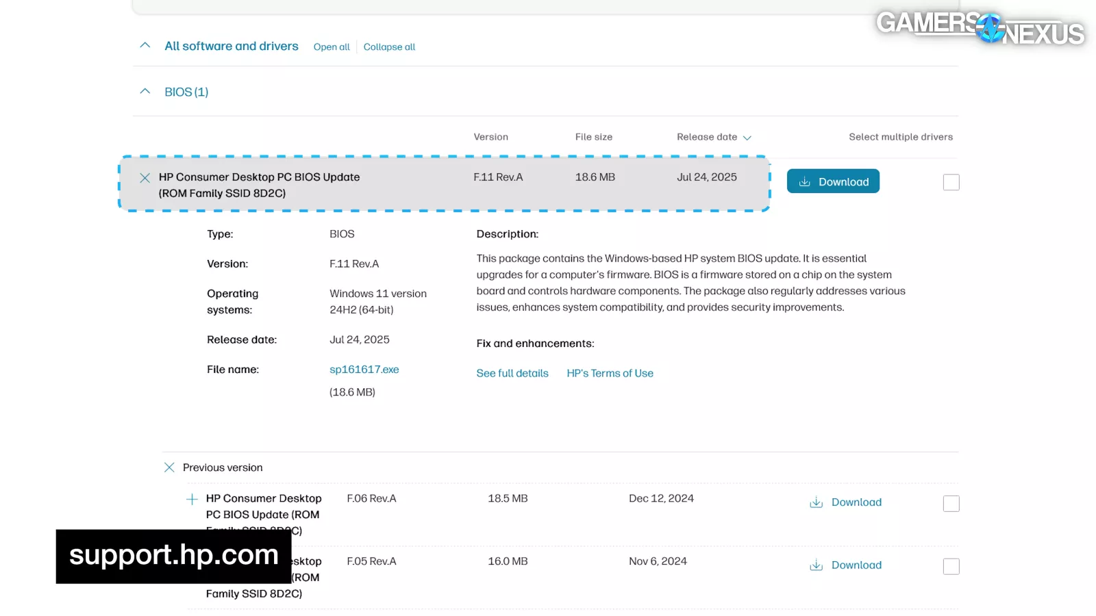 The BIOS for the OMEN 45L is version F.06, released in December 2024. The support page doesn’t show any updates between then and July 2025, but the version number jumping to F.11 makes us think that there were intermediary revisions that have since been removed.