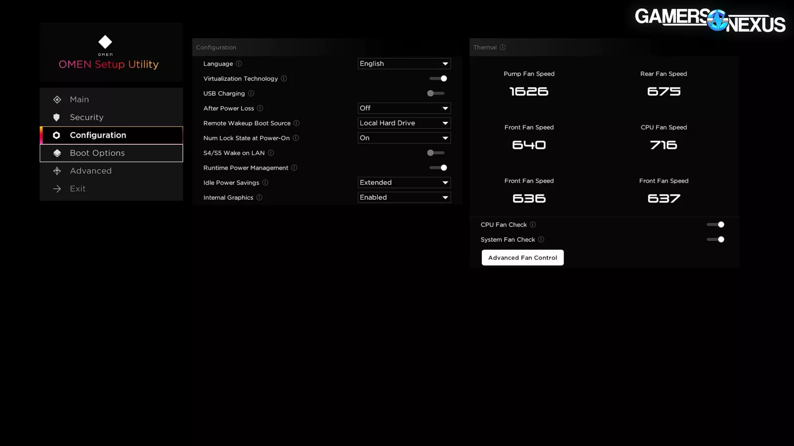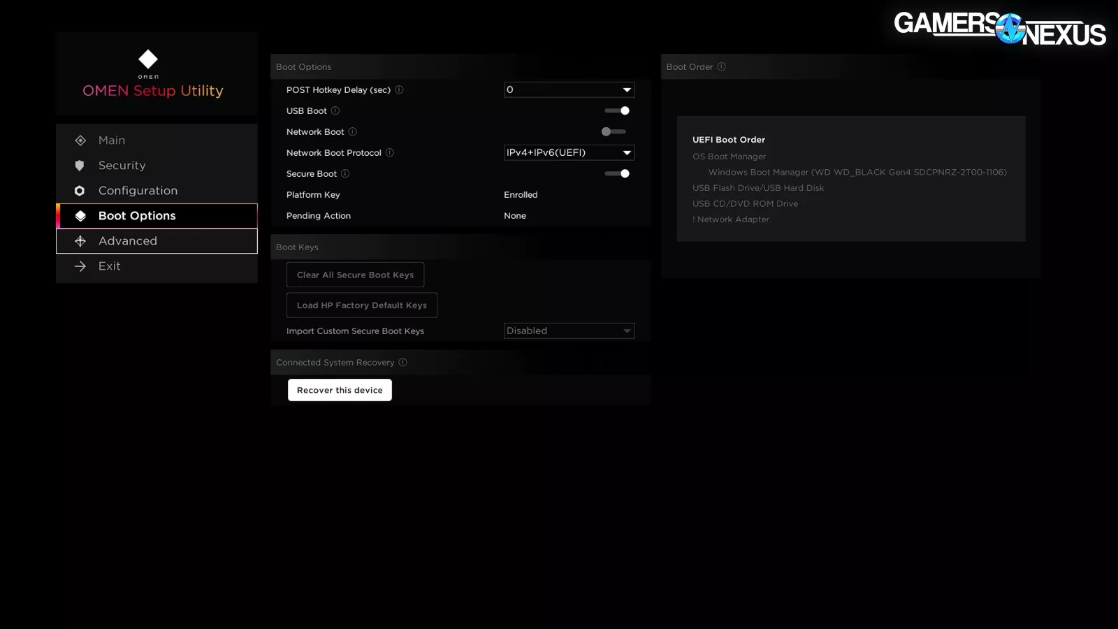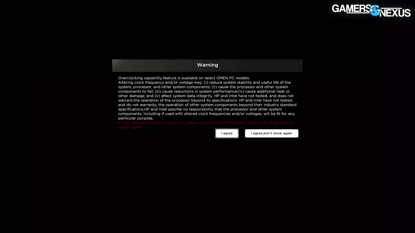 The BIOS itself is stripped-down compared to the full feature sets we’re used to on DIY boards, but enough settings are left exposed to make important tweaks if needed. Opening the Advanced page pops two full screen notifications – one strongly advertising the OMEN Gaming Hub software, and one with a warning about overclocking.