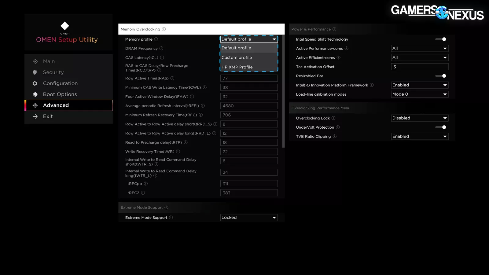 After clicking through, we see that the memory profile is set to default, and not the one that’s literally called “HP XMP Profile.” This is bad enough since that’s a redundant initialism, but it’s made worse by not being enabled. The profile would at least bring the kit up from DDR5-4800 to DDR5-5600.