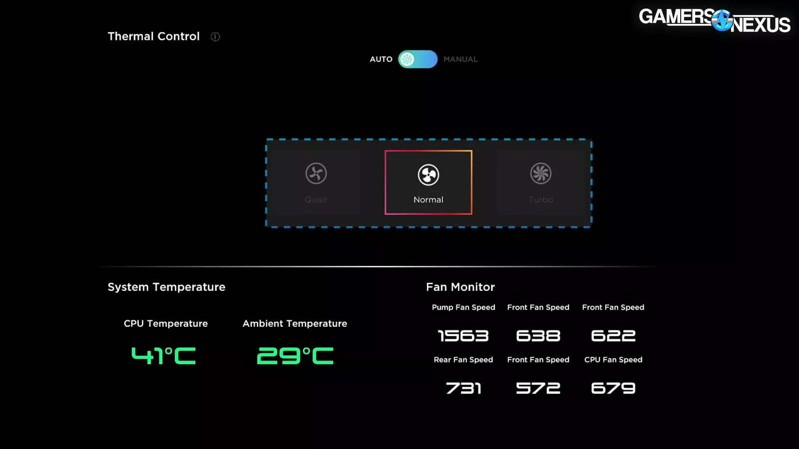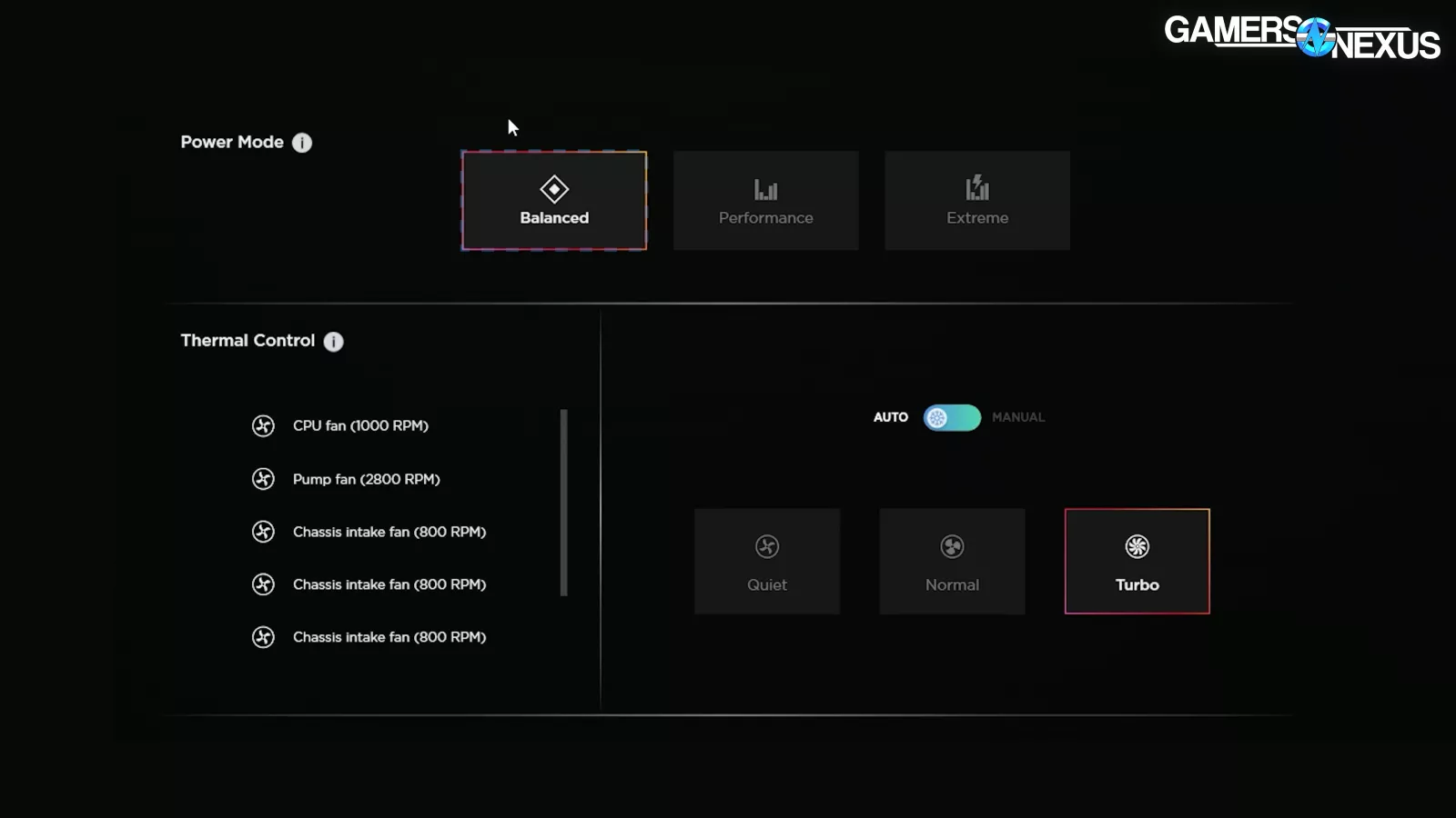 Fan control options were decent. Three pre-set automatic modes (Quiet, Normal, Turbo), and a manual mode that allows for custom curves. We have no complaints here.