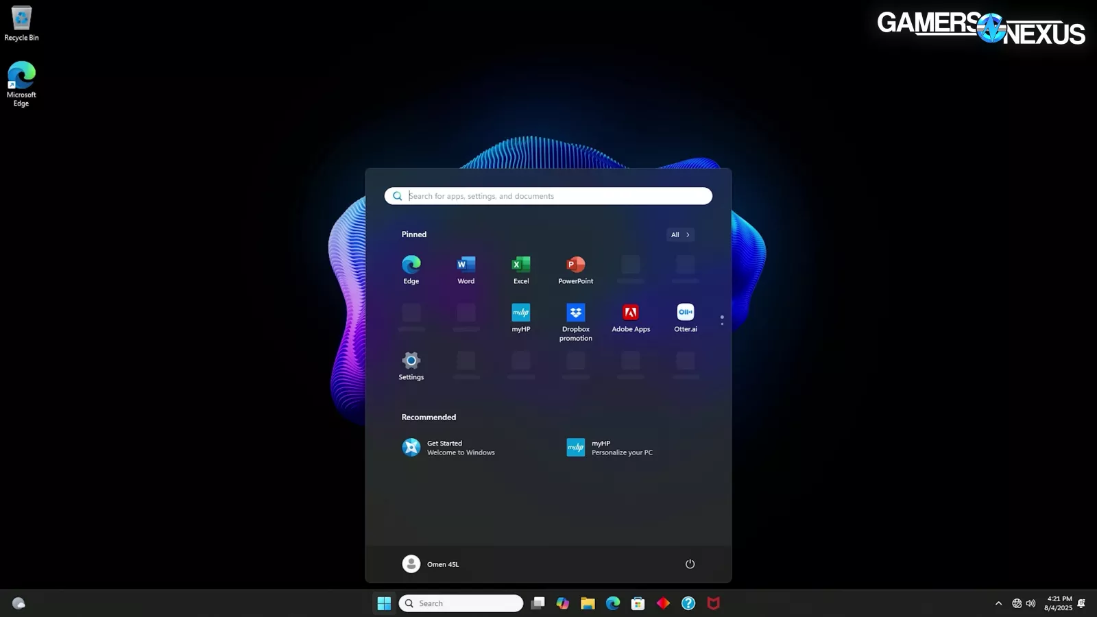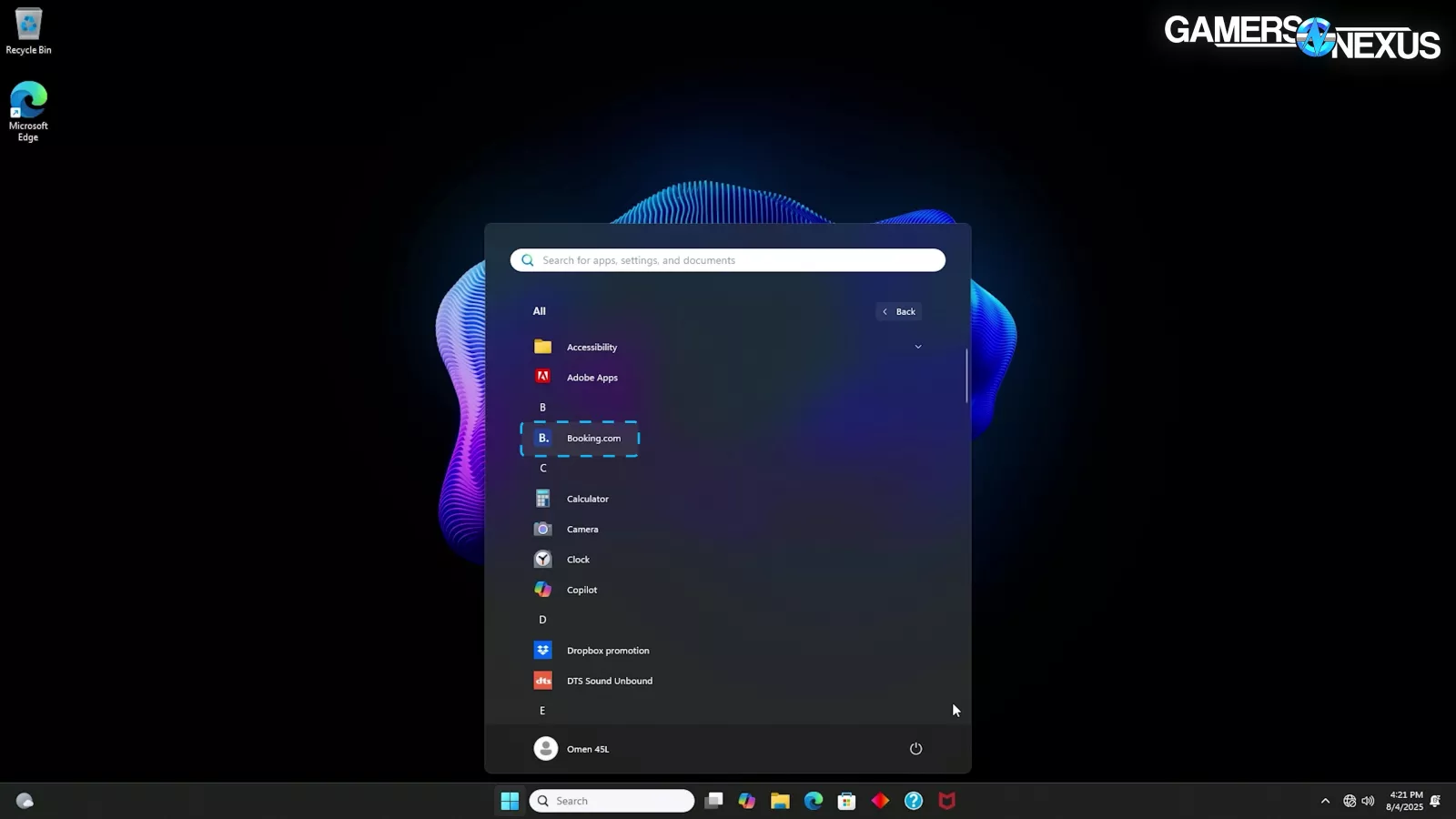 Hitting the desktop brings more disappointment. Behold the bloat: myHP, “Dropbox promotion”, Adobe Apps, and whatever Otter.ai is are pinned to the start menu. The entire apps list also includes Booking.com, which isn’t even remotely related to anything, DTS Sound Unbound, 8 different HP utilities, McAfee, and OMEN Gaming Hub. There are 16 total apps beyond what normally comes with Windows. The OMEN app and a couple of the HP ones are probably useful, but the rest are just trash that HP likely gets money or benefits for including.