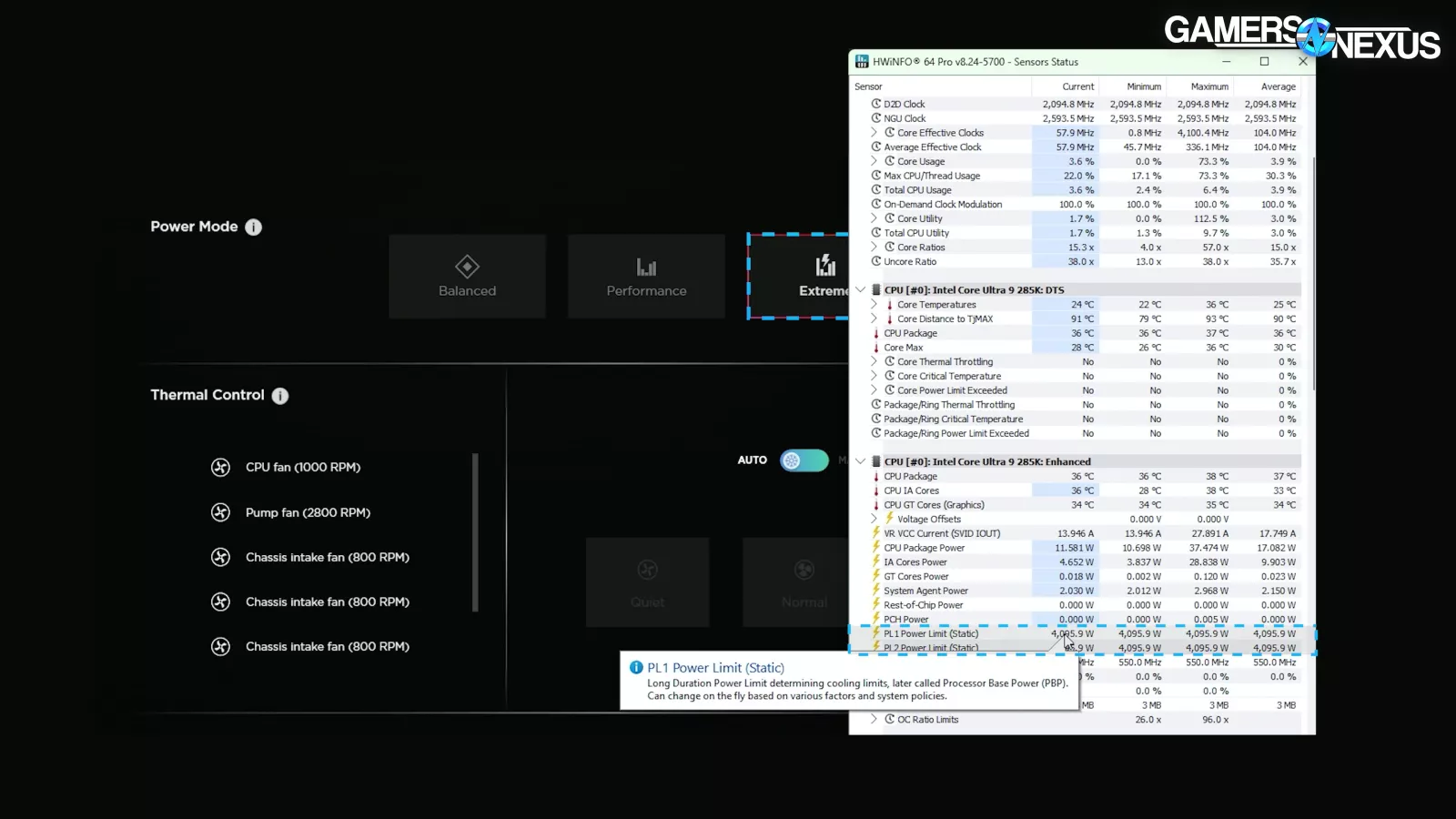 This makes it obvious both why temperatures stabilized and why frequency dropped – something triggered power-limiting behavior, bringing the 285K down to its default 125W “Processor Base Power.” The strange part is that board vendors don’t normally configure Arrow Lake to have an explicit window of time (Tau) to move from a higher to lower power limit. Tau still exists per Intel documentation, but typically goes unused, with PL1 equalling PL2.