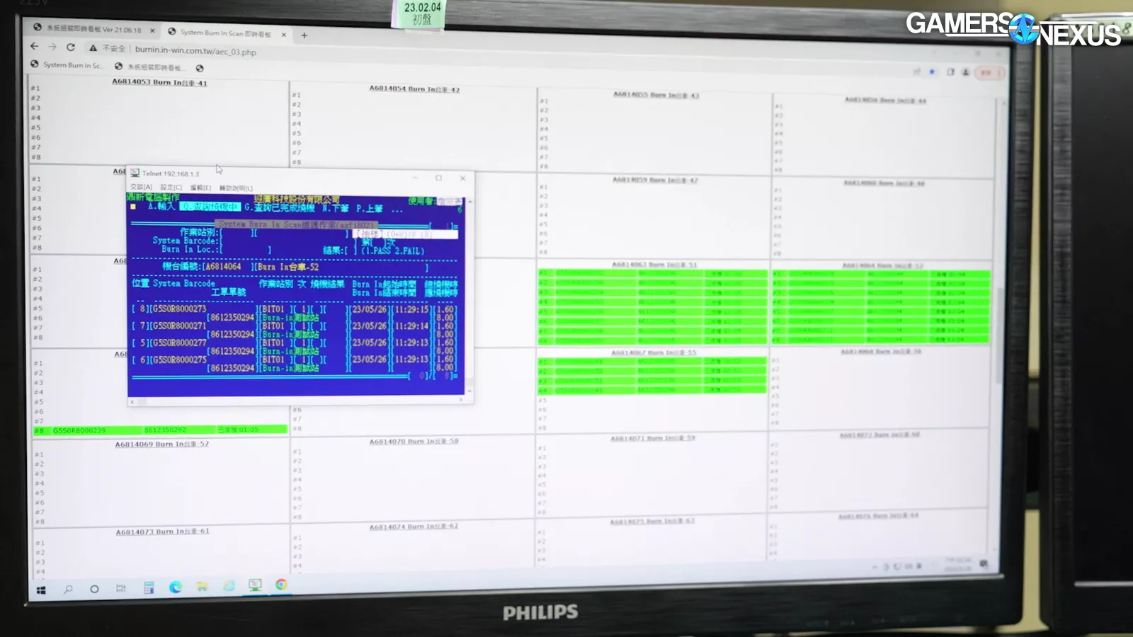 Total burn-in time is 2 hours per server at 10 units per rack. And one guy controls almost all of it -- meet the man with the most powerful index finger in the world, trained from entering BIOS hundreds of times per day.