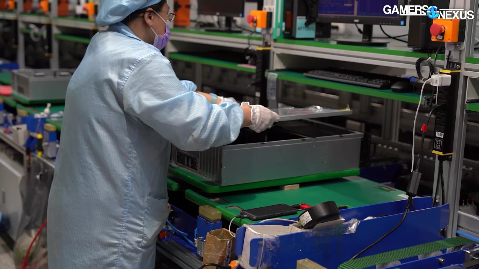 A different line is configured for 2U systems due to changes in process. For full configurations with maximized RAM, an assembly line crew might socket upwards of 1,000 sticks per day. We’re betting the job application asks how strong your thumbs are.