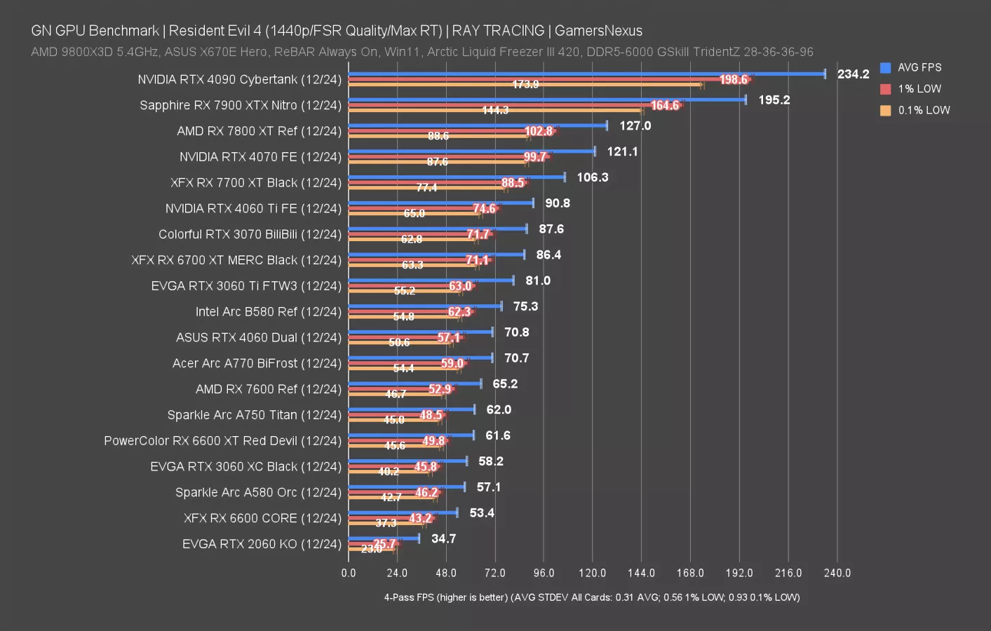Resident Evil 4 is up first. This is a relatively light workload for ray tracing and isn’t as distorted for one vendor or another as some other games.