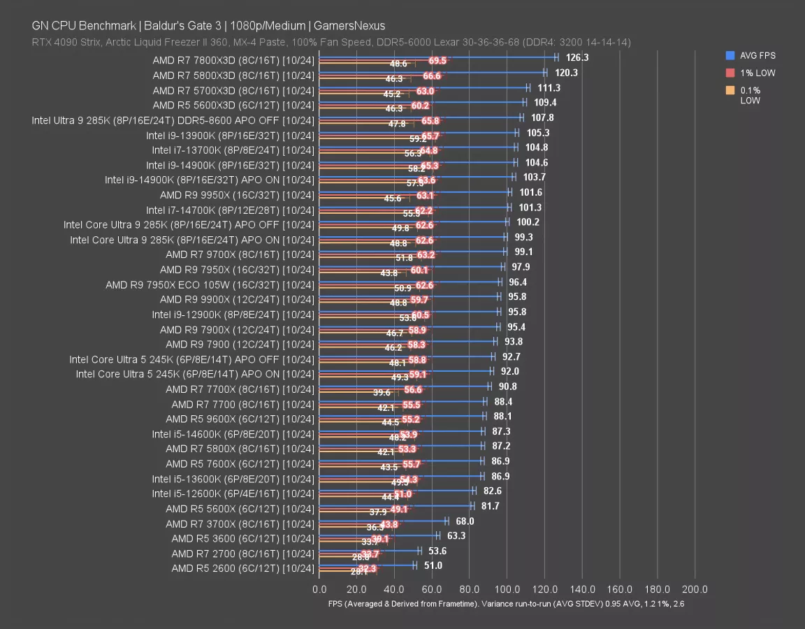 APO actually does something in this game sometimes: We talked about the "exciting" 1.2% gain in the 14900K. The 245K gained 1.8 FPS AVG from APO. Some of that might even not be margin of error. Groundbreaking stuff. That’s almost 0.6%!...