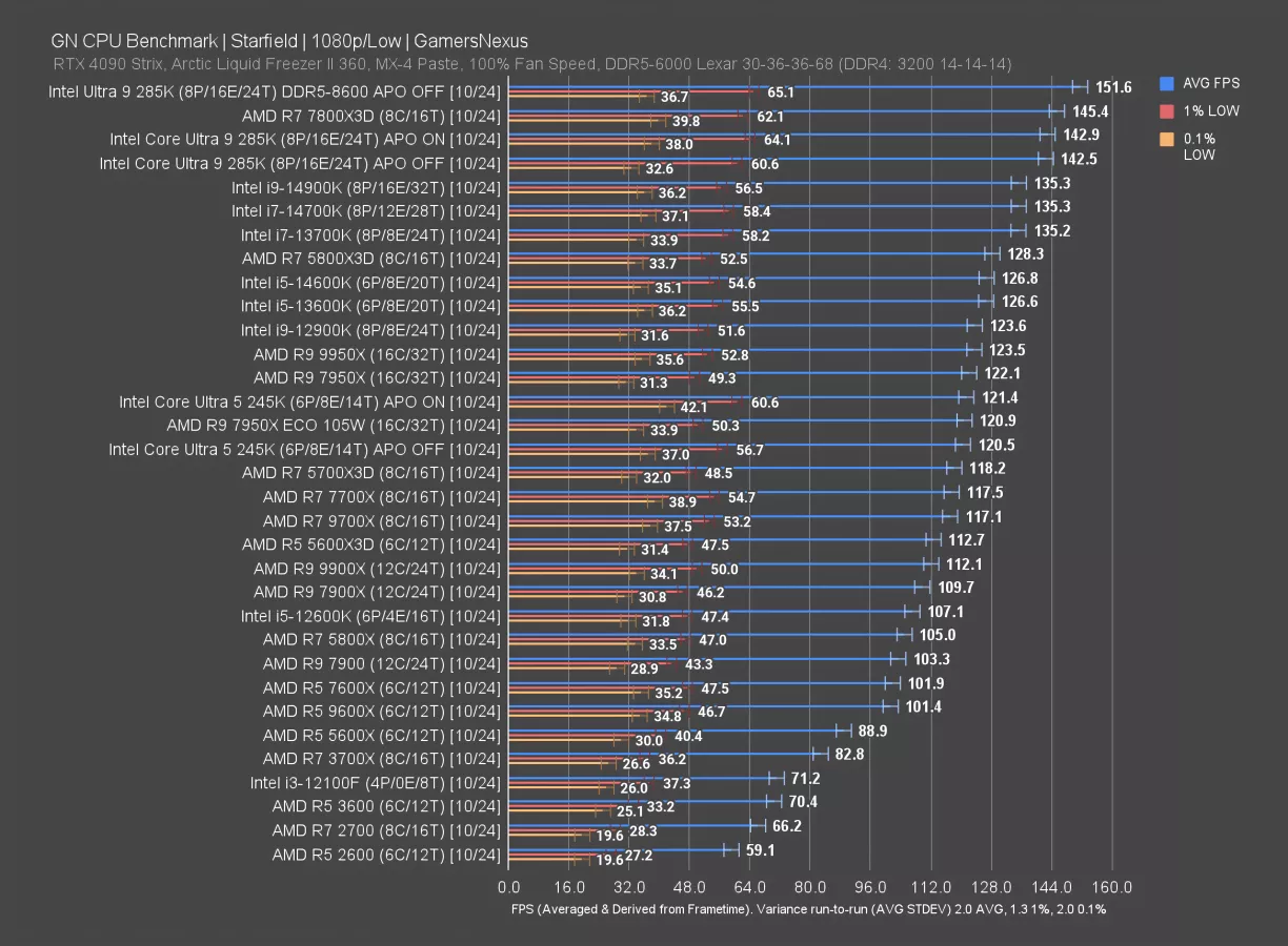 In Starfield, the 245K ran at 121FPS AVG. The 9700X held a 117 FPS result, within about 3% of the 245K but technically behind. The 5700X3D is also slightly behind, at 118 FPS. Intel’s own 14600K breaks away at 127 FPS, a 5% uplift over the 245K. Finally, the new 285K is about 18% ahead of the 245K -- similar to the gains we saw in Rainbow Six.