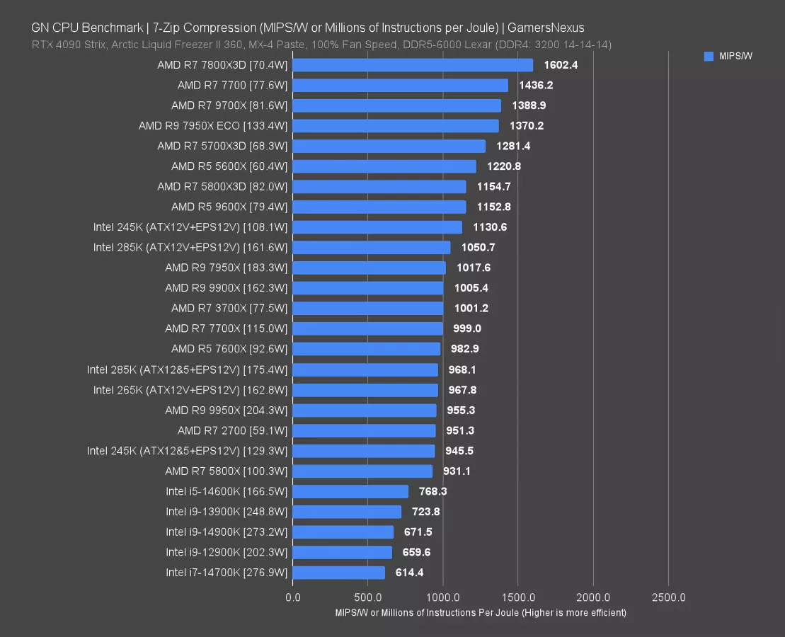 In decompression efficiency, the 265K repeats its rank and falls below the 1194.9 MIPS/W result of the 285K. The power drawn is the same since this test suite runs both consecutively and at about the same power level. The end result is that the 265K is marginally less efficient than the 245K, more meaningfully behind the 285K, and is otherwise mostly just ahead of the prior Intel CPUs. Generationally, the improvement on the 14700K is actually good. It’s 47%. It’s a real uplift, and Intel does deserve credit for that; however, again, the entire top half of the chart is AMD-dominated. It’s just not even close. The 7950X in Eco Mode leads the 265K in efficiency with an advantage of 87%. The 9700X (read our review) is cheaper and also holds a substantial lead, up at 1624 MIPS/W. The 9700X won’t produce as high of a result in this test as the 265K for raw performance, but in efficiency, it is more efficient.