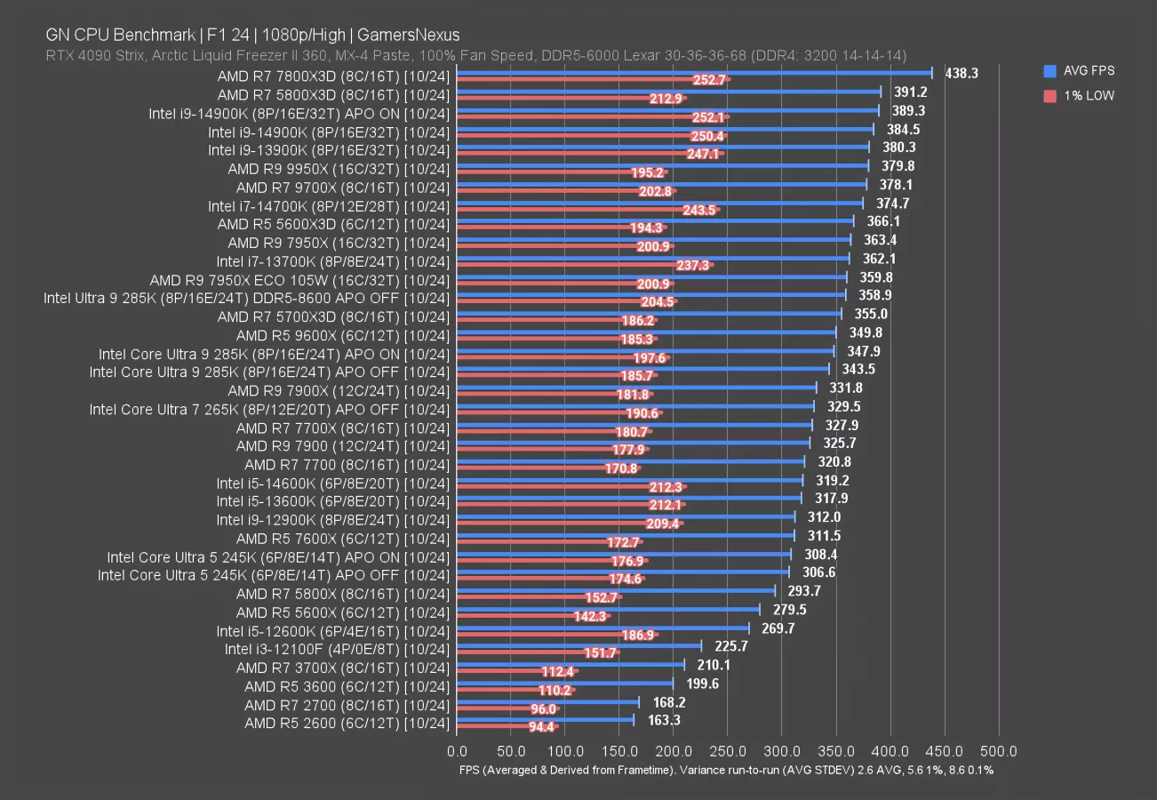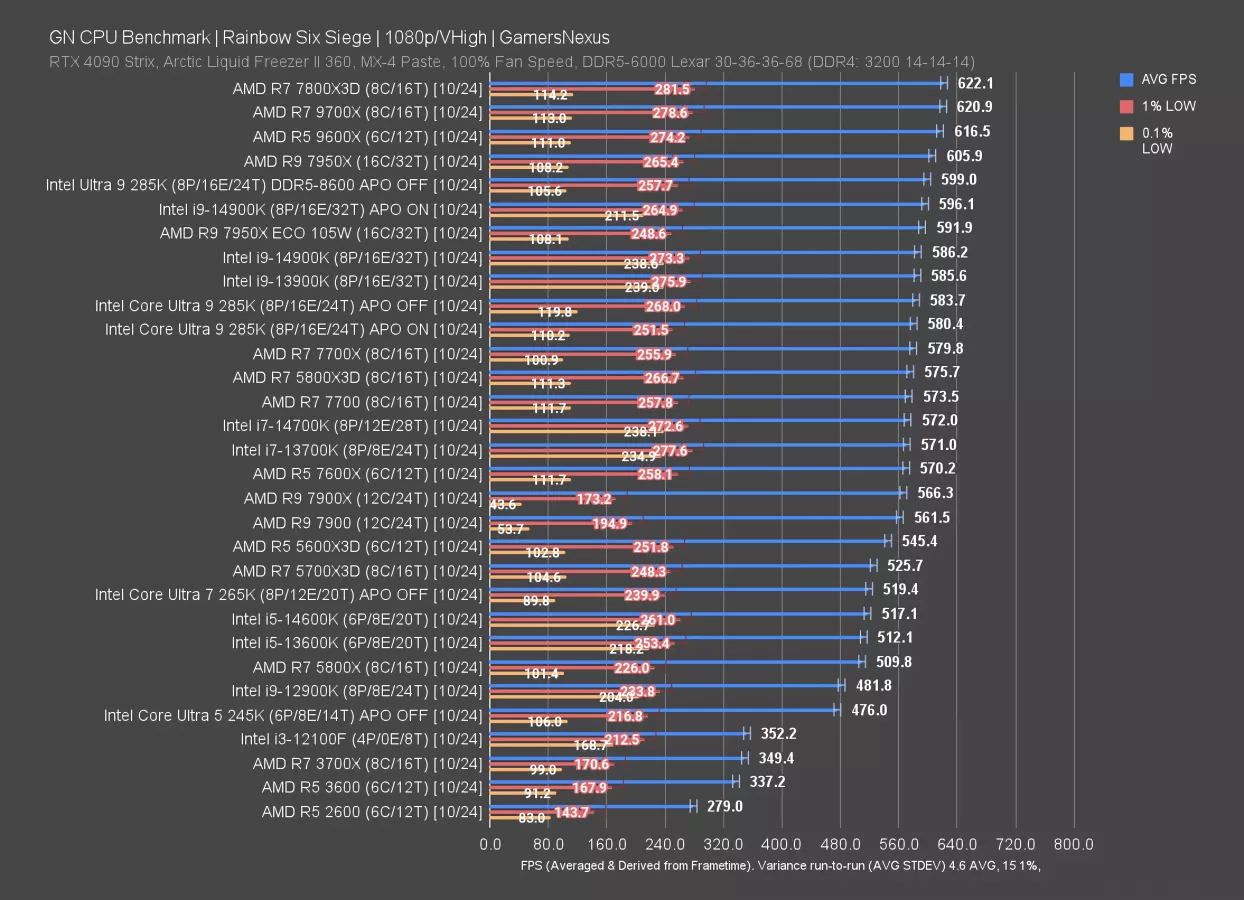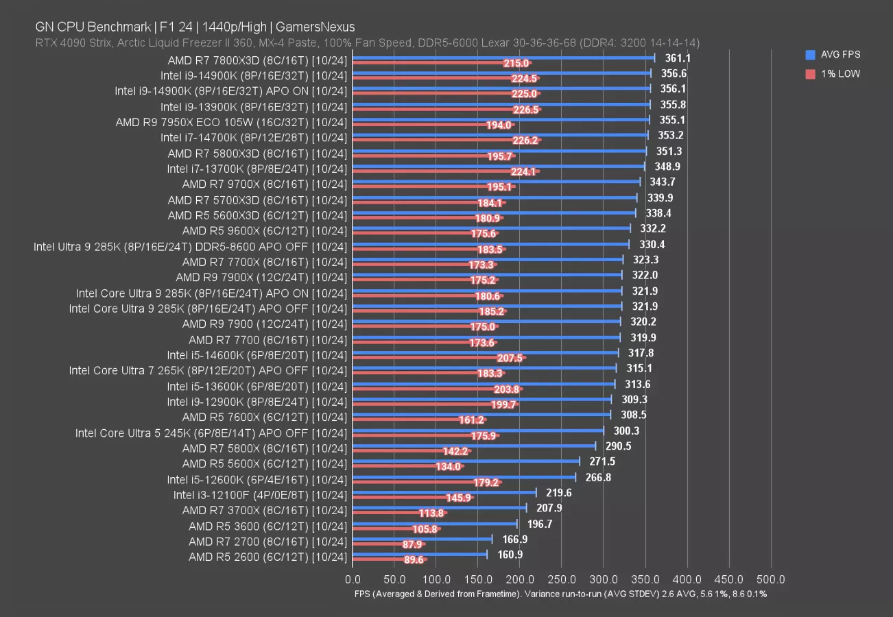 Here’s how it stacks up: The 7800X3D leads the 265K by 20%, the 9600X leads it by 19%, the 14900K with APO off by 13%, and the 285K with APO off by 12%. Even the 7900X (read our review) leads here, and that’s not explicitly been branded as a gaming part, yet competes in both production workloads and price.