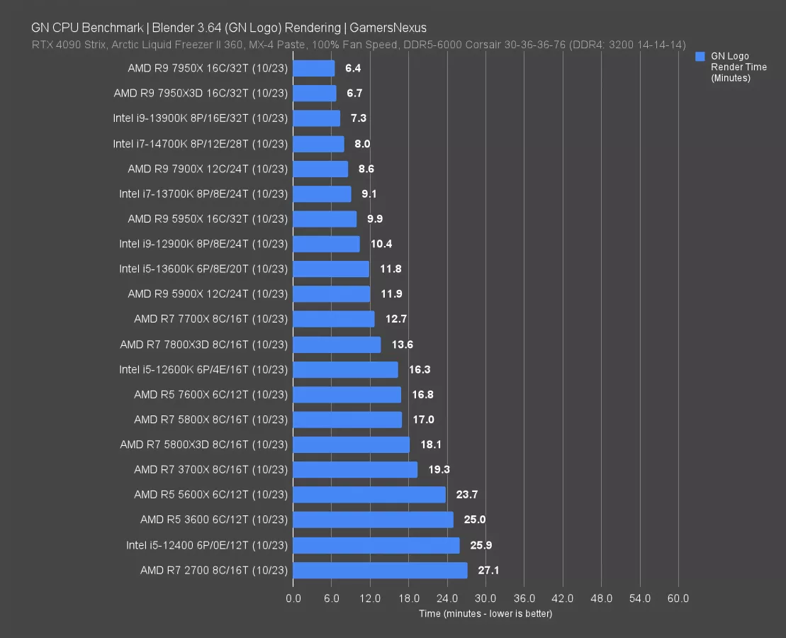 The i7-14700K finished in 8 minutes here, improving upon the 13700K with a 12% reduction in time required to complete the render. The 13900K still outdoes the 14700K by 9%. This is because Blender will use every thread given to it at 100%, so we see more scaling.