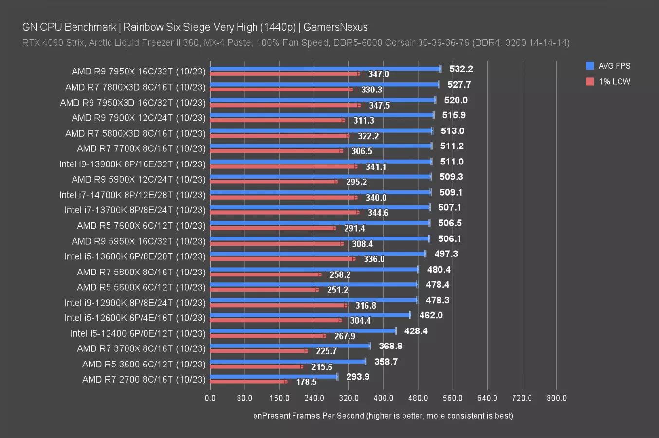 The R7 7800X3D blows way past everything in these charts, setting a ceiling at 717FPS AVG -- that’s impressive for the AMD CPU, especially considering it’s been $350 on US retailers lately.
