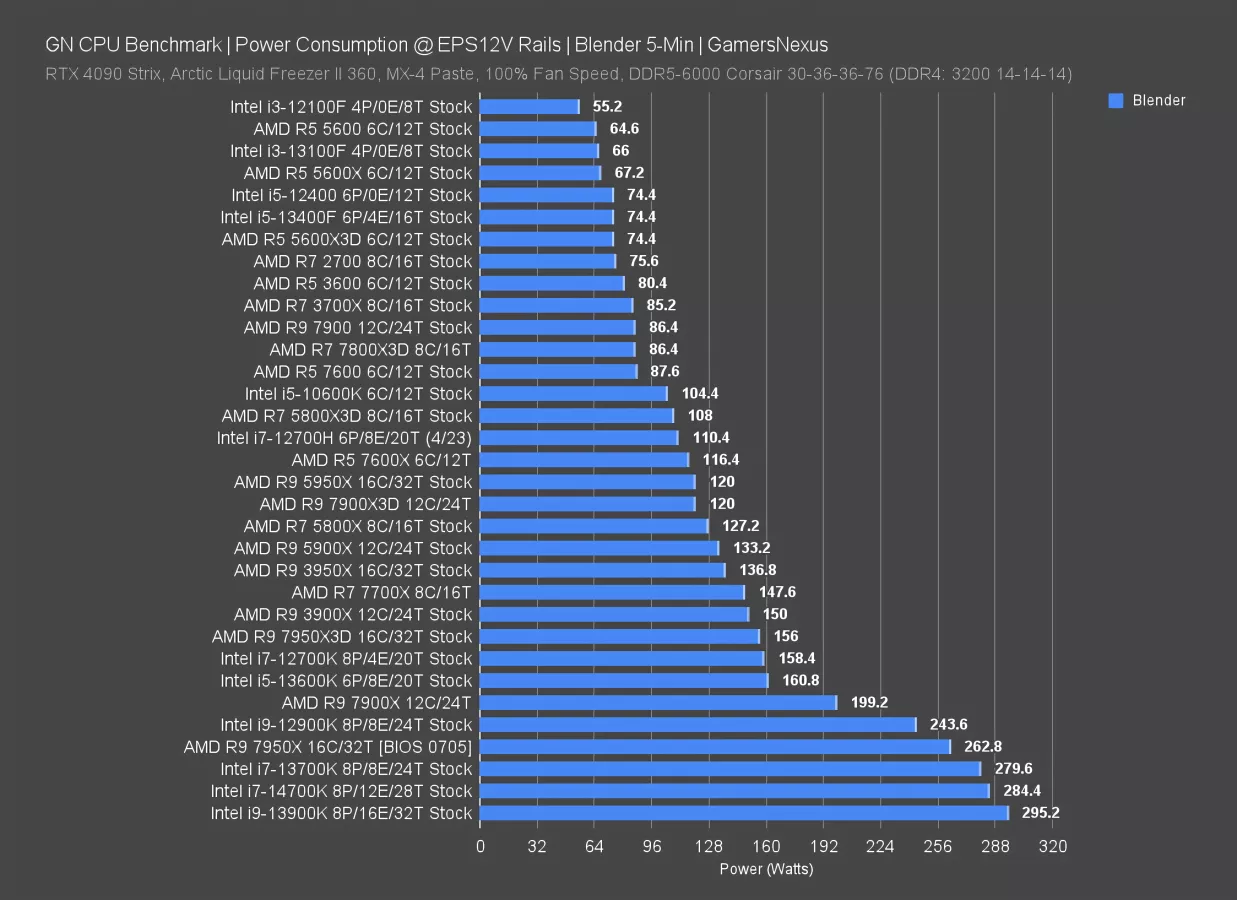 This test looks at all-core power consumption in a Blender workload.