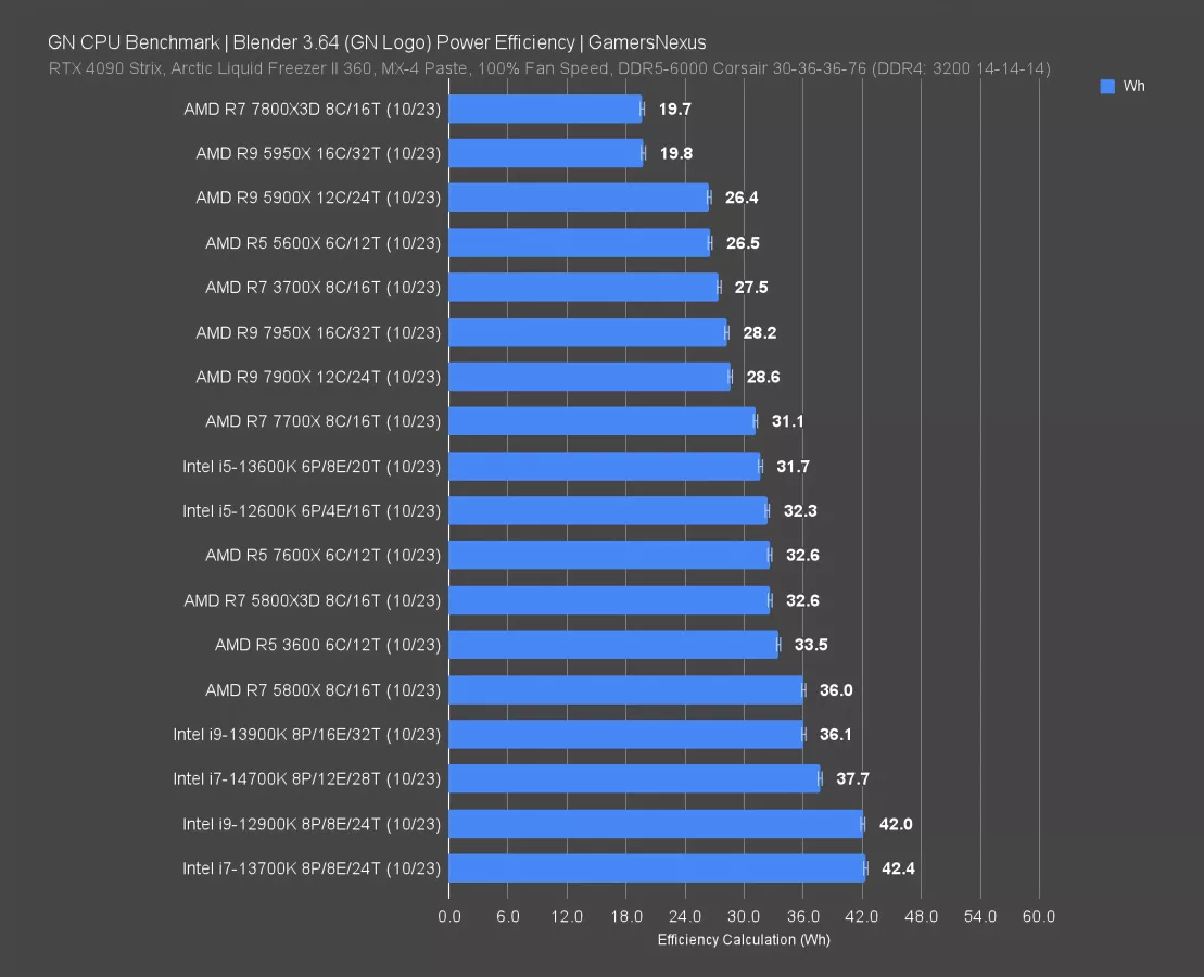 Energy efficiency is next. This is calculated by taking our Blender time required in minutes and running a simple watt-hours calculation against the power consumption. The end result is the energy consumption required to complete a full render -- so faster is better in isolation, but depending on the power consumption, it may be less energy efficient.