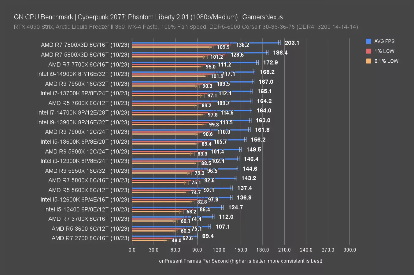 But, to be fair, this is a title where you’d want to favor Intel if you expect to be CPU-bound. The lead is a meaningful 23% over the 7800X3D for the 14900K.
