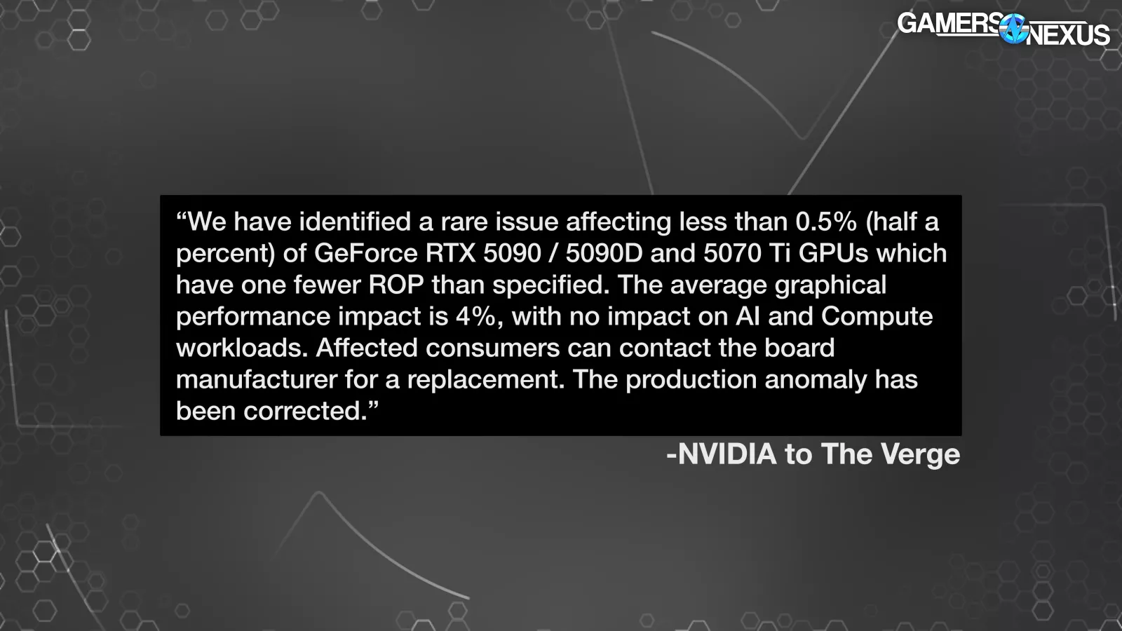 NVIDIA acknowledged this issue shortly after it emerged, but only for the 5070 Ti (read our review) and 5090 (read our review). It almost immediately somehow knew exactly how many units were affected, which further reinforces our belief that NVIDIA would have known about this, with the company pinning it to 0.5% of units. The company did not name the 5080 -- it also didn’t really apologize and we felt it downplayed the performance impact to the lowest number, which would be 4% on the 5090. It didn’t mention that the 5070 Ti and 5080 impact would be greater.
