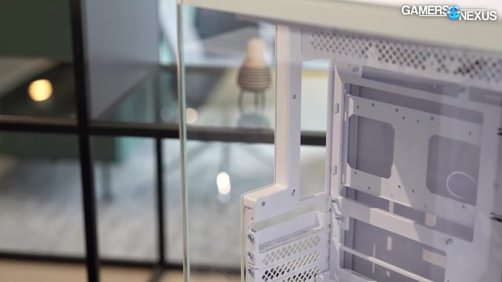 On the back of the case, it has large ventilated holes both vertically and horizontally. Taking the back panel off, one thing we’d like to see is refinement on the magnetic filters. Currently, they’re not done yet but you can see a lot of metal ending up in the hexagon-shaped cut-outs. If they could punch out larger holes or use a finer mesh and get rid of the dust filter or something like that, that would help a lot with thermal performance and letting air through.