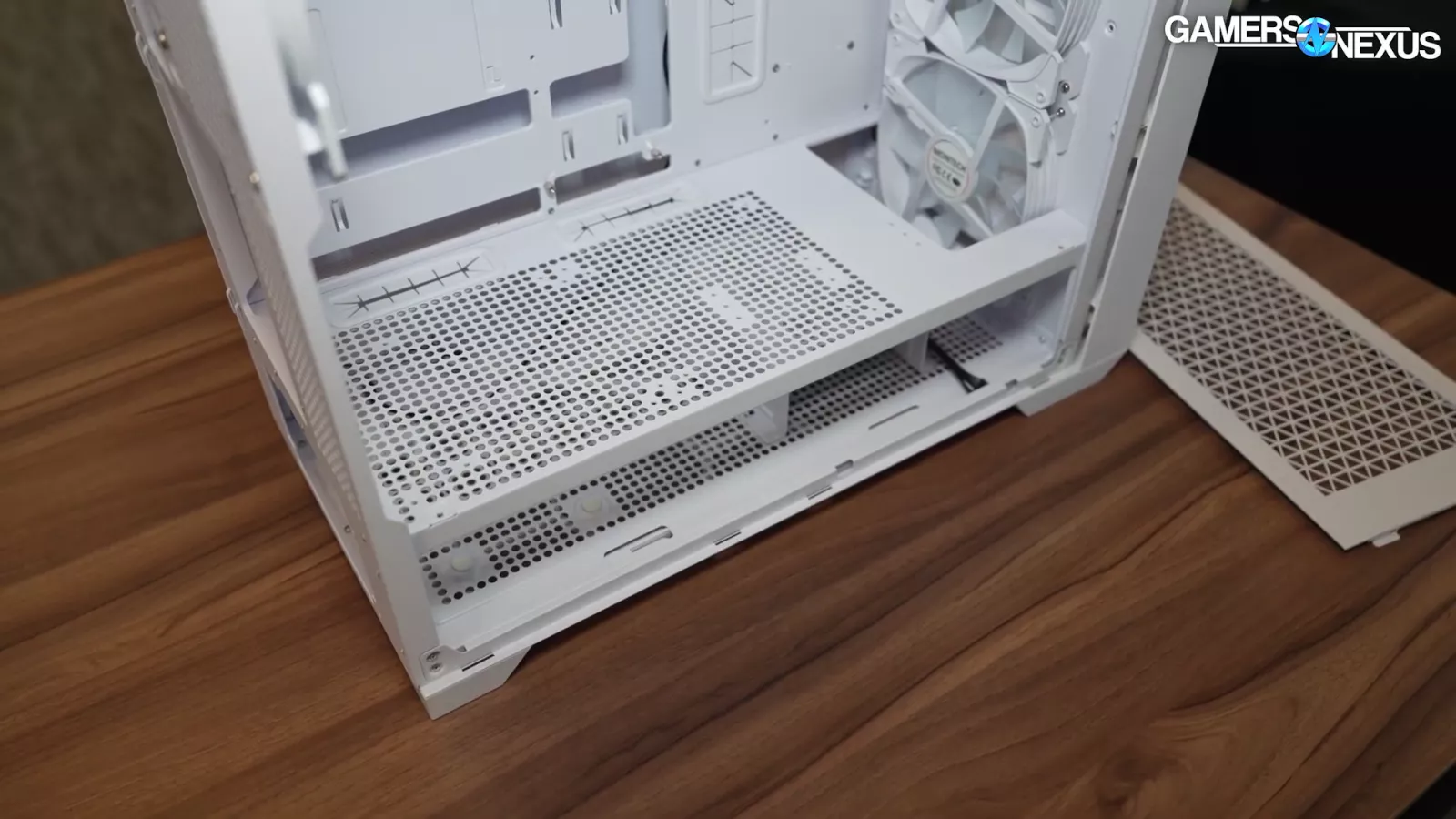 Overall, we have some critiques to the case, but it's finalized. The biggest ones we have for this case include the aforementioned side-panel ventilation and the fact that when the fans are oriented towards the front bottom of the case, the drive cages underneath end up blocking potential air intake from underneath the chassis, but then again, there’s not a lot of space for air to come in through the bottom to begin with. As a result, the bottom fans don’t have much access to intake aside from small ventilated areas.
