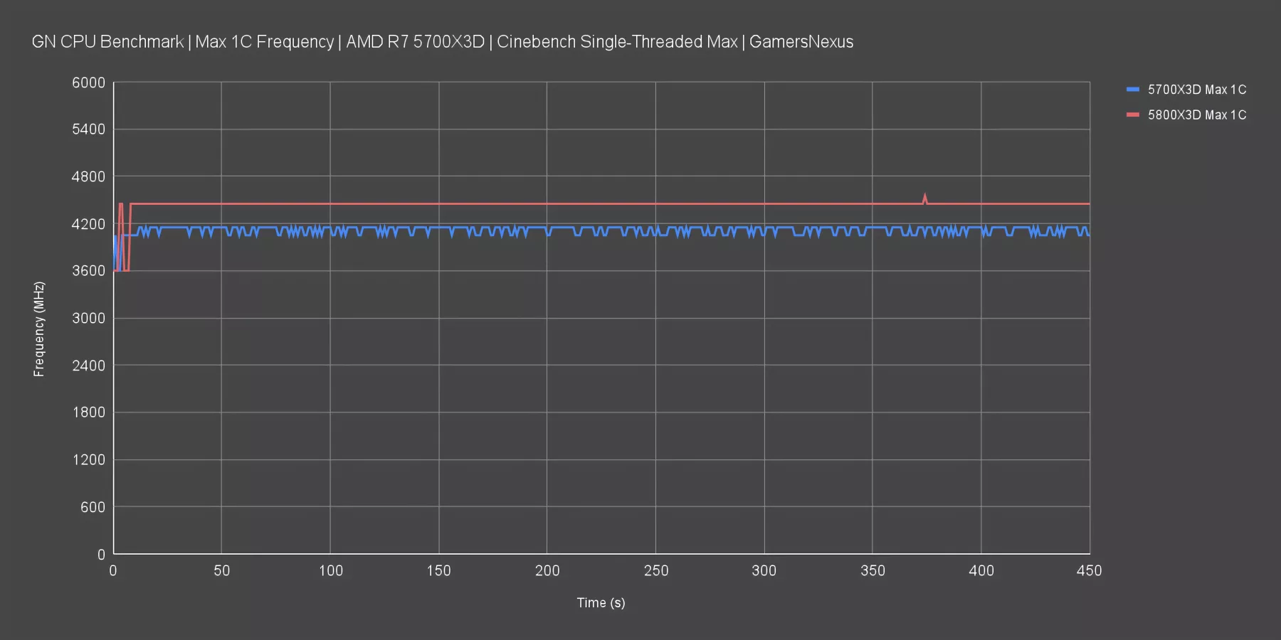 In a single-threaded workload, the maximum frequency we measured here of any given core for the 5700X3D was commonly 4150MHz. That’s about 50MHz over advertised, so that’s great to see. The 5800X3D was about 4450MHz.