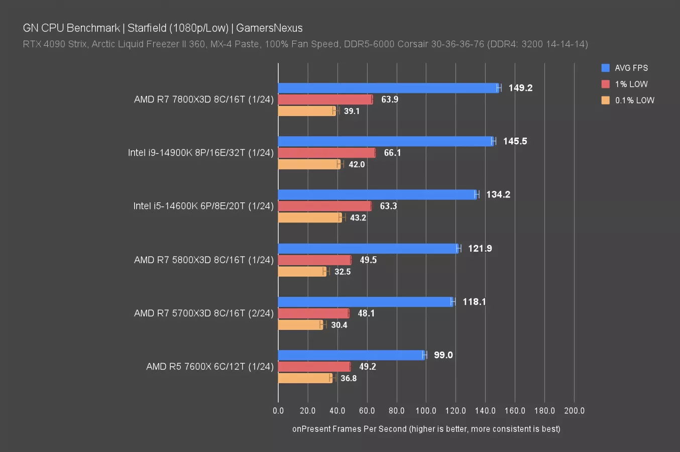 At 1080p/High, the 14900K and 7800X3D (watch our review) become constrained by GPU requirements, despite the RTX 4090. The 5800X3D is about 3% better than the 5700X3D and neither hits the GPU ceiling. The 14600K maintains its 13% lead over the new R7 5700X3D CPU.