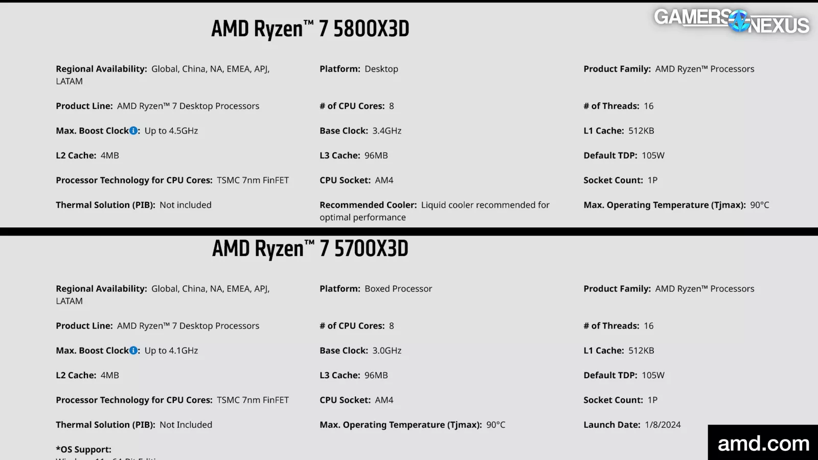 As for why these exist, we think the most likely reason just comes back to binning. It’s the same as the story we broke with the 5600X3D, just a different part. AMD can sell 5800X3Ds all day long, so they probably don’t strictly “need” a 5700X3D. It will bring some renewed enthusiasm, but it’s also possible that some percentage of these CPUs exist because the chips couldn’t hit and sustain those elevated clocks, but can hit the lower 5700X3D clocks.