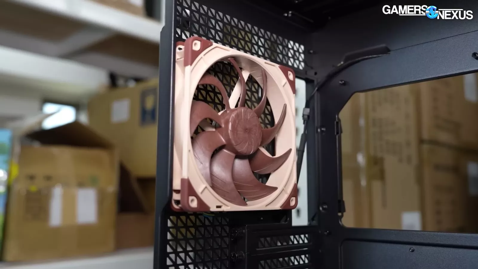 The case is the same size and layout as the original Flux Pro and has 2x120mm fans on the bottom (the original featured reverse blade fans on the bottom). The fans used here are the NF-A12 G2s, which are new fans. The rest of the case uses NF A14 G2 fans. This includes 3 of them in the front and 1 in the back. The G2 model we talked about in our NH-D15 G2 review has its fans slightly offset the RPM intentionally to try and avoid beat-frequency phenomenon and such that will create an undesirable noise.