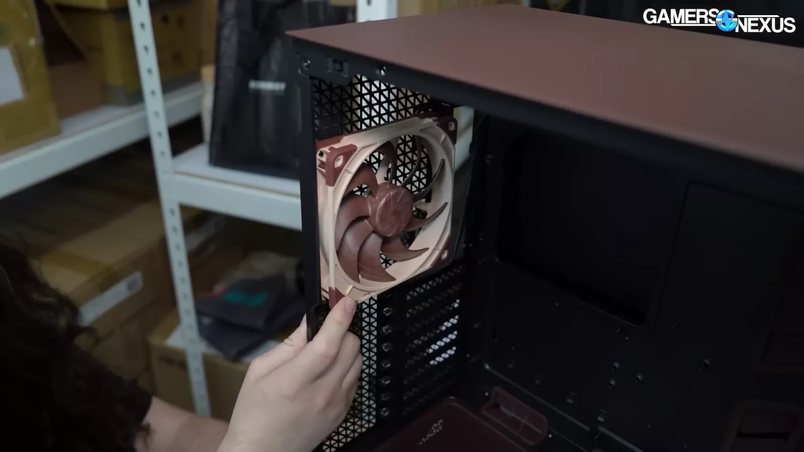 The case has a lot of aluminum in it. The model at Computex also came with Noctua fans, but they’re not brown. Specifically, the case featured Noctua’s black NF-A20s, which are fans we’ve reviewed and benchmarked. They did pretty well in our testing.
