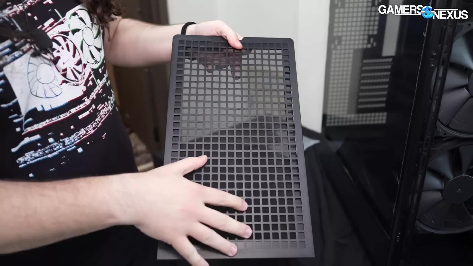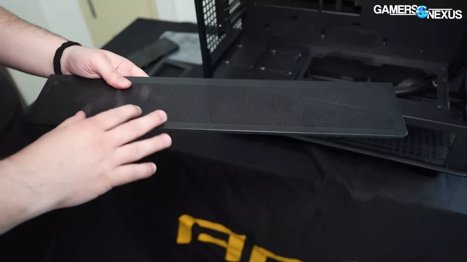 Looking at the top panel, it uses massive holes in its design coupled with a dust filter. In some ways, this is traditional. The upside is that the actual panel itself isn’t doing a whole lot other than just providing the structure, which means it’s not really getting in the way of airflow because of how huge the holes are. It’s really going to come down to the dust filter for how much air can get through. If you’re going to use the top panel for exhaust, we would recommend pulling the dust filter off because it’s not stopping a whole lot of dust.