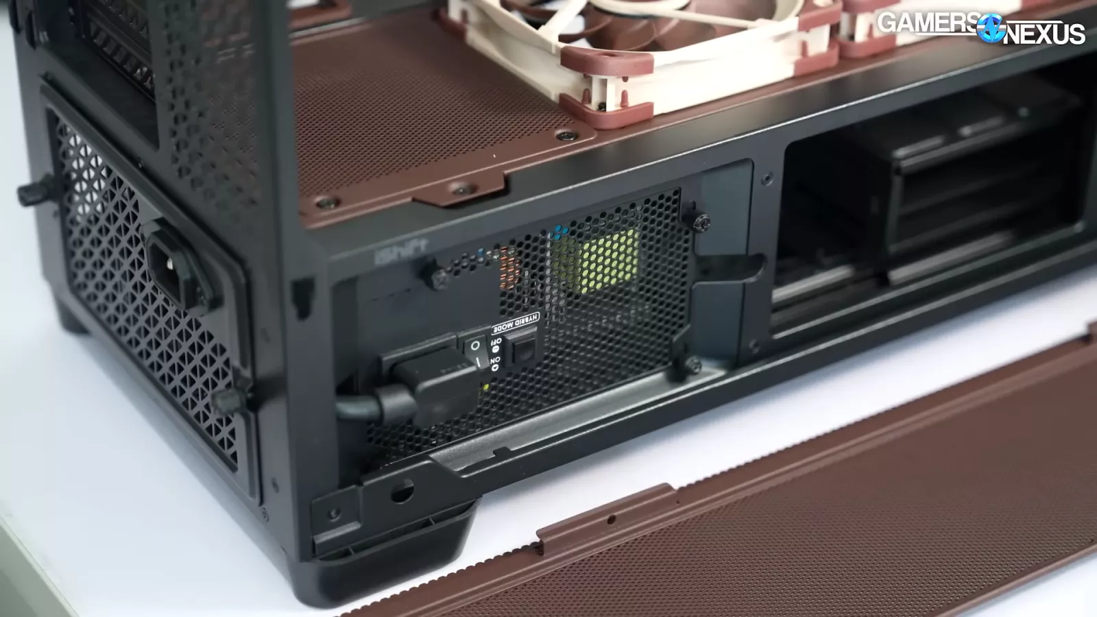 Internally, the brown rubber grommets were apparently more difficult than the steel panels to be the correct shade of brown. You can’t use the same mixture between the 2 materials. The top of the power supply shroud is another steel component that is also brown. They are removable mesh inserts, which we talked about in our review of the Flux Pro. Other than the fans and color difference, the tooling of the case is the same.